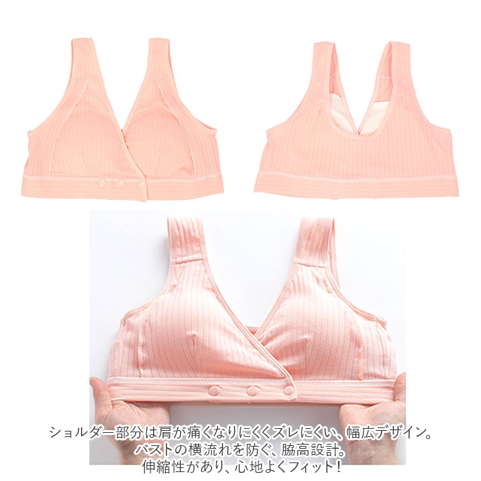 ・3段階サイズ調整可能な、フロントオープンタイプ。片手で簡単にボタンが外せるので、授乳もラクラク!