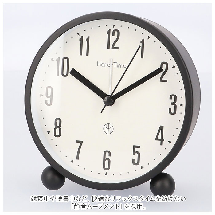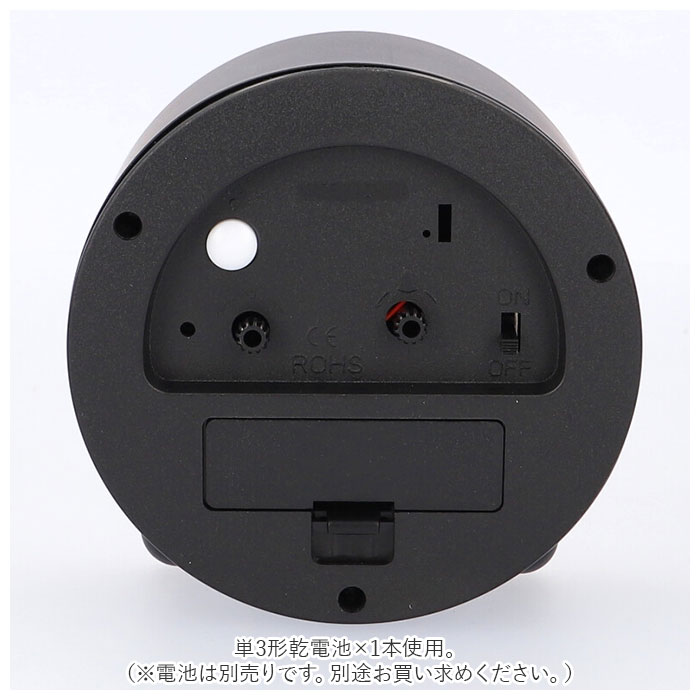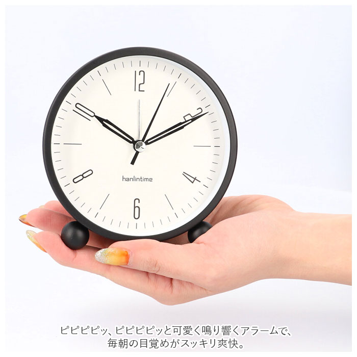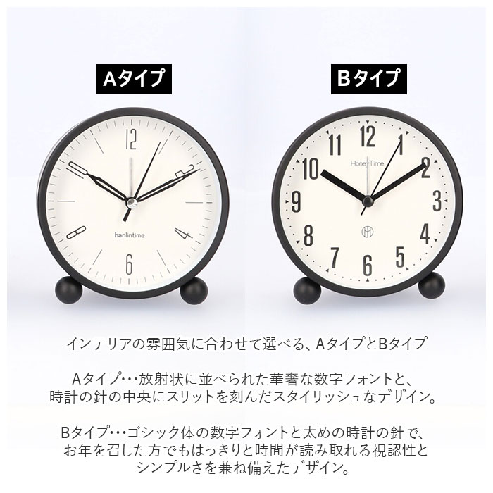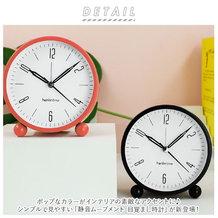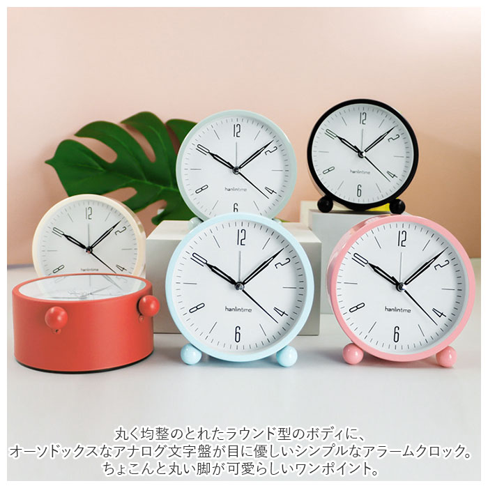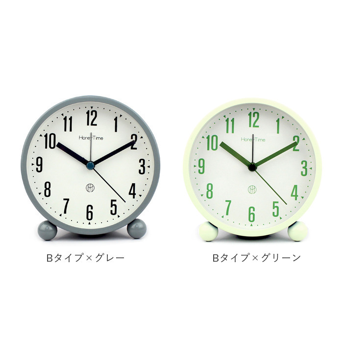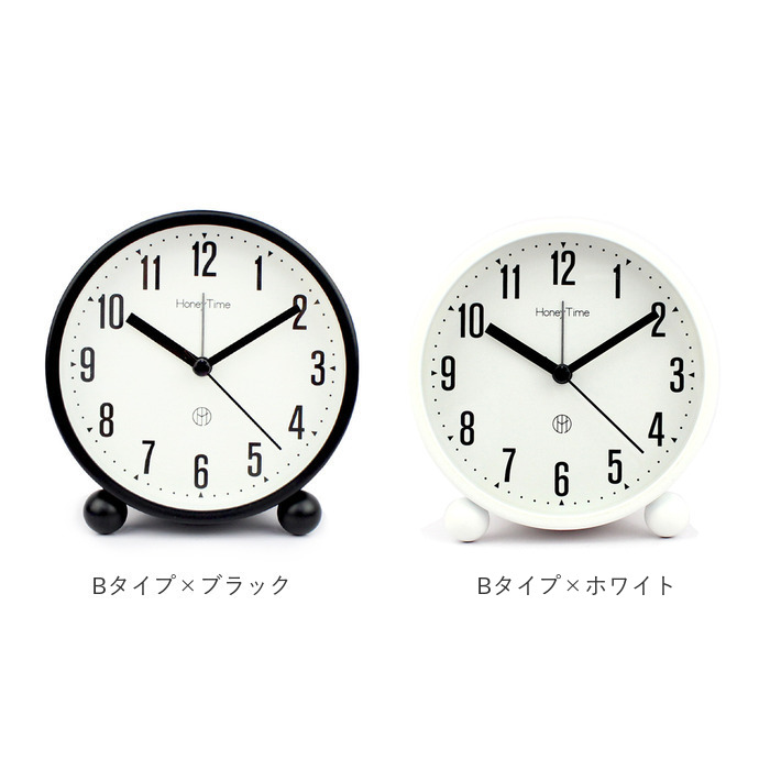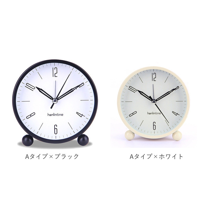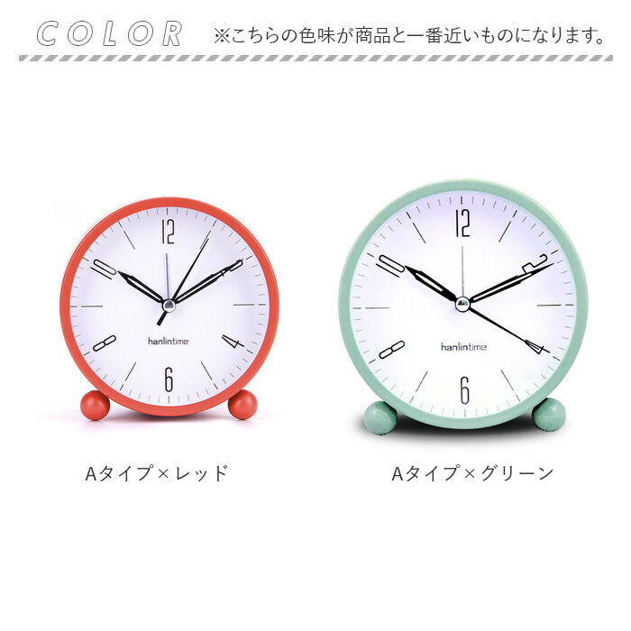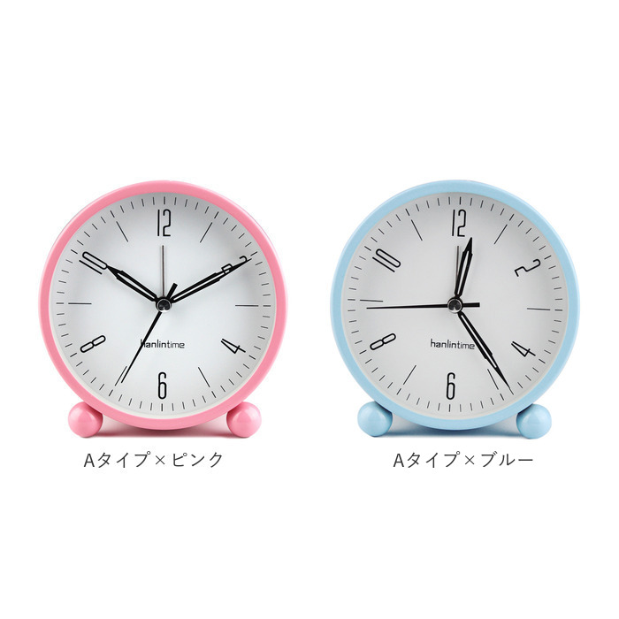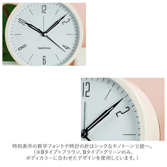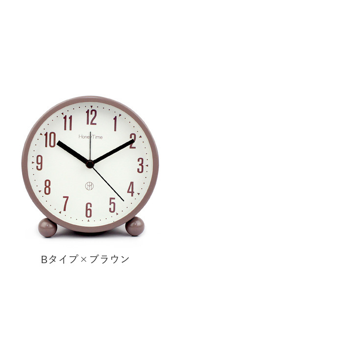 | ・ポップなカラーがインテリアの素敵なアクセントに♪シンプルで見やすい「静音ムーブメント 目覚まし時計」が新登場! ・丸く均整のとれたラウンド型のボディに、オーソドックスなアナログ文字盤が目に優しいシンプルなアラームクロック。ちょこんと丸い脚が可愛らしいワンポイント。 ・時刻表示の数字フォントや時計の針はシックなモノトーンで統一。主張しすぎない文字盤デザインが静かに流れるおうち時間にフィット。(※Bタイプ×ブラウン、Bタイプ×グリーンのみ、ボディカラーに合わせたデザインを使用しています。) ・就寝中や読書中など、快適なリラックスタイムを妨げない「静音ムーブメント」を採用。秒針の音が気になってしまう方や、自室や書斎でテレワークをされる方にもオススメ。 ・背面のボタンを押すと、文字盤にほのかに灯りがともるバックライト機能付きなので、照明を暗くした寝室でも時間の確認がスムーズ。 ・ピピピピッ、ピピピピッと可愛く鳴り響くアラームで、毎朝の目覚めがスッキリ爽快。 ・シンプルで誰でも使いやすく、お仕事で毎朝早起きされる方や、学生さん用の目覚まし時計に最適! ・単3形乾電池×1本使用。(※電池は別売りです。別途お買い求めください。) ・インテリアの雰囲気に合わせて選べる、AタイプとBタイプ、2種類の文字盤デザイン。 ・Aタイプ・・・放射状に並べられた華奢な数字フォントと、時計の針の中央にスリットを刻んだスタイリッシュなデザイン。 ・Bタイプ・・・ゴシック体の数字フォントと太めの時計の針で、お年を召した方でもはっきりと時間が読み取れる視認性とシンプルさを兼ね備えたデザイン。 |