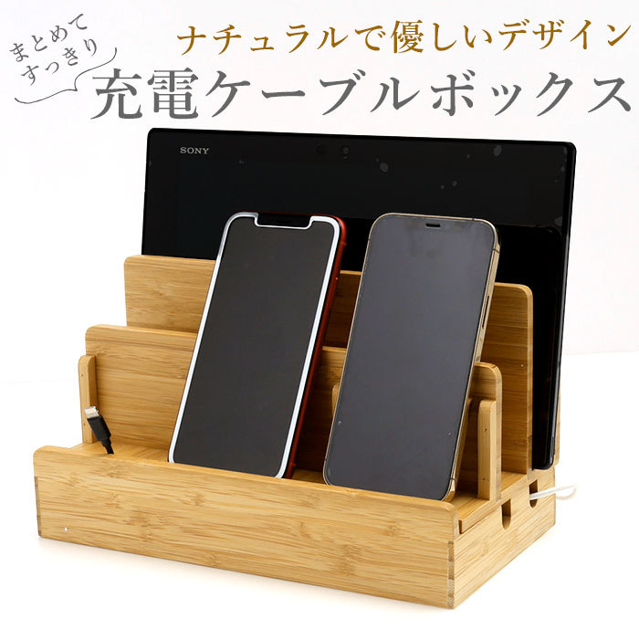 | ・スマホやタブレットなどの大切なガジェット類を充電しながらすっきり収納!ナチュラルな充電ケーブルボックス。 ・木目の風合いが美しい、全面に竹素材を使用したスタンドタイプの充電ケーブルボックス。前面にスマートフォンを3台、中央と背面のスリットにタブレットやノートPCが収納可能。 ・前面に3つ、側面に4つのケーブルの通り穴が用意されており、スタンド下部の台座内部に充電器や充電ケーブルがすっぽりと収納できる構造。 ・背面のケーブル穴は、延長コードや電源コンセントに接続しやすいように大きめに設計。デスク回りやコンセント周辺で絡まりがちな配線をカバーしてすっきりとした外観に。 ・木の温もりを感じられる優しいデザインがインテリアに素敵にマッチ!テレワークの作業テーブル用にもオススメ。 |