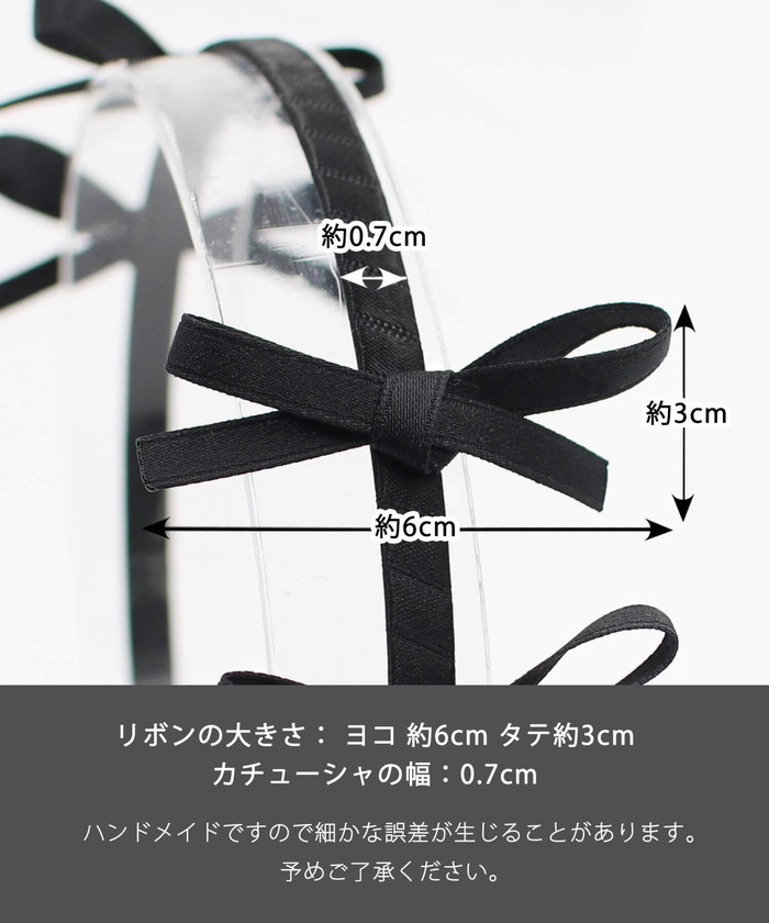 | カチューシャの幅:7mm リボンの幅: ヨコ 約6cm/タテ約3cm (ハンドメイドですので細かな誤差が生じることがあります。予めご了承ください。) |