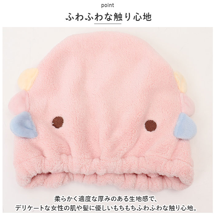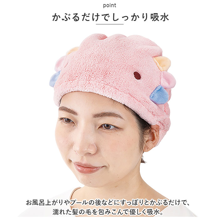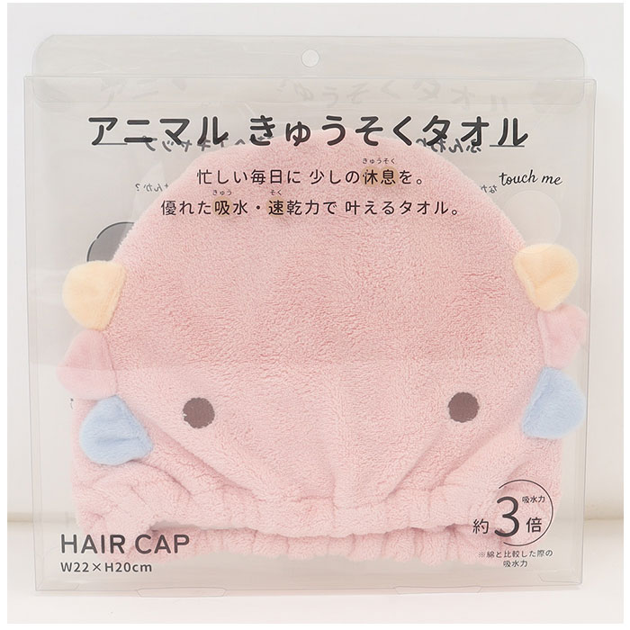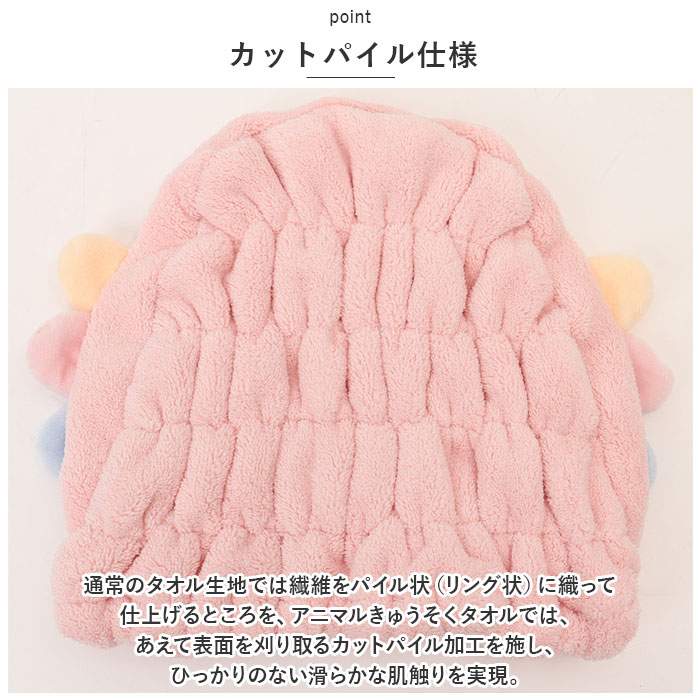 | ・ふわふわアニマルたちにほっこり癒される♪大人気「アニマル きゅうそくタオル」シリーズに「ヘアキャップ」が仲間入り。 【きゅうそくタオルって・・・?】 ・忙しい毎日に少しの「休息」を。アニマルきゅうそくタオルは、すぐれた「吸」水・「速」乾力で「きゅうそく」を叶えてくれるタオルシリーズ。 【かぶるだけでしっかり吸水】 ・お風呂上がりやプールの後などにすっぽりとかぶるだけで、濡れた髪の毛を包みこんで優しく吸水。 【カットパイル仕様】 ・通常のタオル生地では繊維をパイル状(リング状)に織って仕上げるところを、アニマルきゅうそくタオルでは、あえて表面を刈り取るカットパイル加工を施し、ひっかりのない滑らかな肌触りを実現。 【抜群の吸水力】 ・吸水量が綿の約3倍のマイクロファイバー素材!繊維の間にある大量の隙間で水分を一時的にため込んで、グングン吸水、サッと乾く! 【ふわふわな触り心地】 ・柔らかく適度な厚みのある生地感で、デリケートな女性の肌や髪に優しいもちもちふわふわな触り心地。 【ぐ〜んと伸びて、ピタッと装着】 ・頭回りはぐーんと伸びる伸縮性ゴム入りなので、髪の毛にボリュームのある方やロングヘアーもすっぽり包めるゆったりサイズ。 【湯冷め防止にも効果的】 ・優れた吸水力で、洗髪後のドライヤーの時間が短縮でき、湯冷め防止にも効果的。髪へのダメージも軽減できるのが嬉しいポイント。 【ご家庭で簡単お洗濯!】 ・洗濯ネットに入れて優しくお洗濯すれば、毎日のお手入れもラクラク。(※色落ちや毛羽落ちしますので、他のものと別にお洗濯してください。) 【ほっこりアニマルデザイン】 ・つぶらな瞳は刺繍、ぴょこんと飛び出たお耳やお鼻は立体的に表現。大人用にはもちろん、お子さまも楽しくヘアドライができる可愛らしいアニマルデザイン。 【お気に入りのコとリラックス】 ・お着替え中、髪の毛から滴る水分をアニマルたちがキャッチ!なかなか乾かないストレスを解消して、浮いた時間はアニマルと一緒にホッとリラックス♪ |