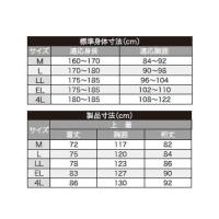 | M、L、LL、EL、4L 【参考標準身体寸法】 ・Mサイズ 適応身長:160cm〜170cm 適応胸囲:84cm〜92cm ・LLサイズ 適応身長:175cm〜185cm 適応胸囲:96cm〜104cm ・4Lサイズ 適応身長:180cm〜185cm 適応胸囲:108cm〜122cm 【製品寸法】 ・Mサイズ [着丈]約72cm [胸囲]約117cm [裄丈]約82cm ・LLサイズ [着丈]約78cm [胸囲]約123cm [裄丈]約86cm ・4Lサイズ [着丈]約86cm [胸囲]約130cm [裄丈]約92cm ※サイズについて詳細は、画像をご覧ください。 ※サイズは当店平置き実寸サイズです。実際の商品とは多少の誤差が生じる場合がございます。あらかじめご了承ください。 |