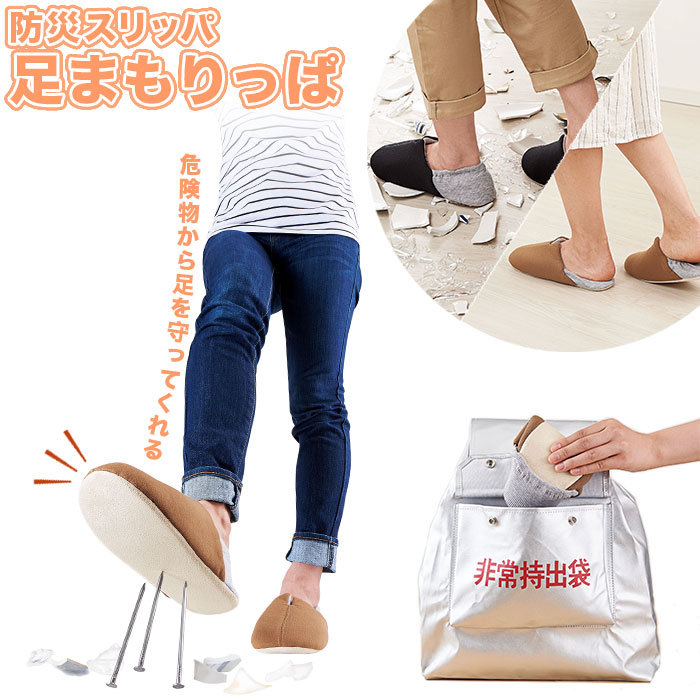 | ・災害や震災時に飛び散ったガラス片から足を守る防災スリッパ「足まもりっぱ」が発売。(※室内履き専用) ・底面内部は複数の異なる素材のシートを重ね、足裏をしっかりと守る構造!釘を通さない特殊シートも内蔵されており、危険物から足を守ってくれる。 ・かかとを立てても踏んでも履ける2WAY仕様。非常時にはかかとを掛けて履くことで危険物の侵入を防いでくれる。 ・さらにかかとにピタっとフィットするので、脱げにくいのもポイント。 ・日常生活では、かかとを踏んでいつものスリッパと同じようにサッと履ける♪ ・シンプルなデザインで、普段使いにもぴったり。生活の中に防災を取り入れることで、突然の災害時も慌てることなく身を守ることができるアイテム。 |