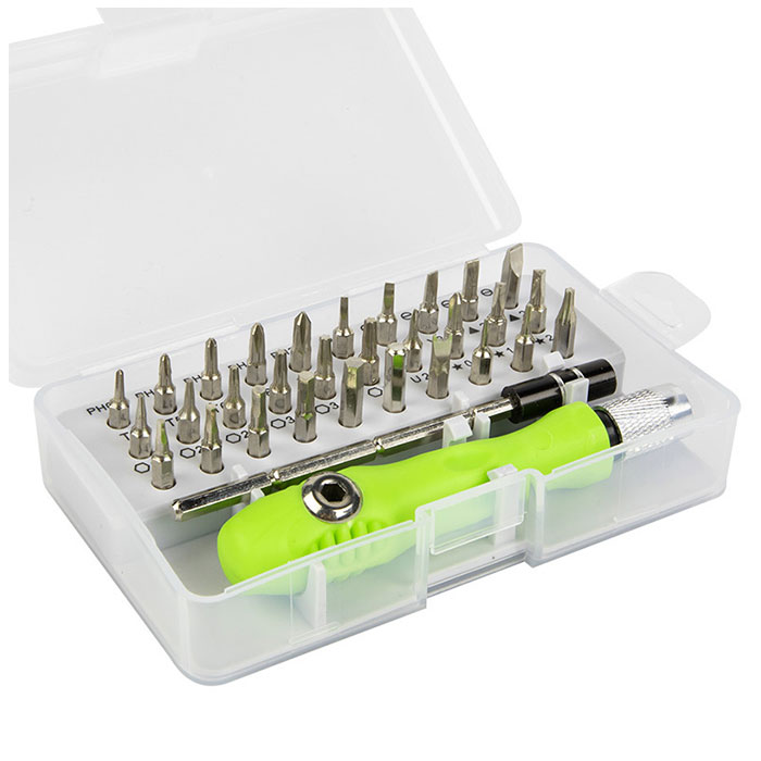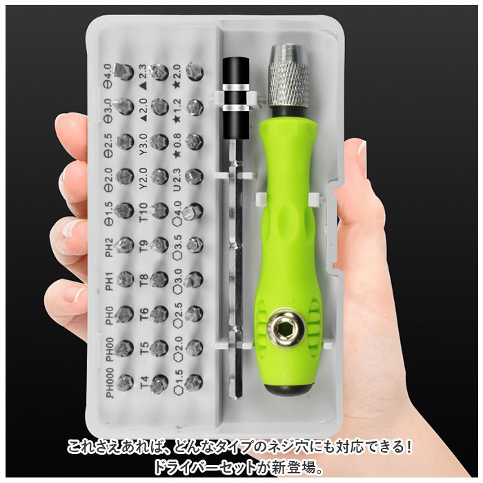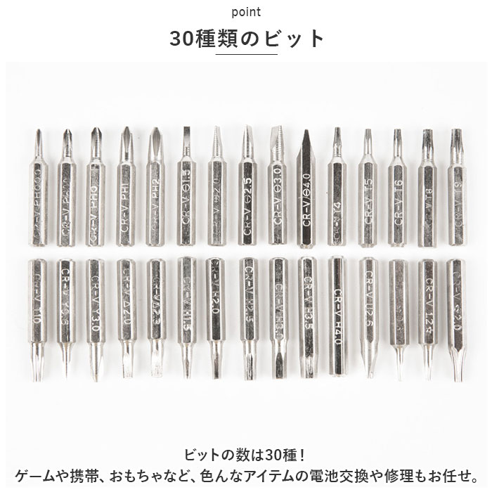 | ・これさえあれば、どんなタイプのネジ穴にも対応できる!ドライバーセットが新登場。 【30種類のビット】 ・ビットの数は30種!ゲームや携帯、おもちゃなど、色んなアイテムの電池交換や修理もお任せ。 【ワンタッチ着脱】 ・アタッチメントの黒い部分にマグネットを内蔵。ビットの着脱がスムーズで、外れにくいのもポイント。 【使いやすいようにアレンジOK】 ・アタッチメントはお好みや使うアイテムに合わせて、長さを3段階調節OK。グリップの側面にもアタッチメントを取り付けできる穴があり、T字型にセットすることも可能。 【すっきり収納】 ・中身がひと目でわかるクリアケース付き。ドライバーもビットもまとめてすっきり収納できるコンパクトサイズで、持ち運びもラクラク。 |