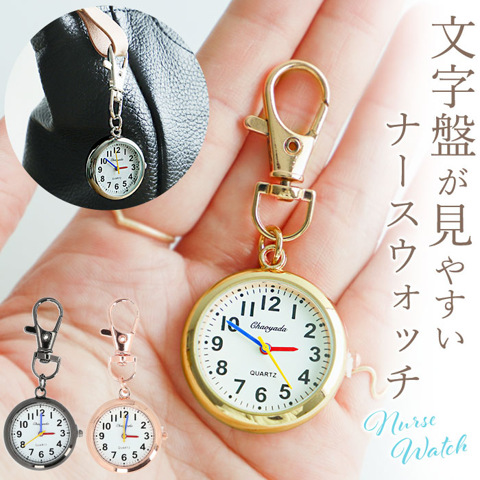 | ・文字盤がシンプルで見やすい!機能的でカワイイ「ナースウォッチ」が登場! ・文字盤の数字には、視認性の高いフォント(字体)を採用。長針・短針・秒針も色分けされていて、コンパクトでも時間がはっきり読み取れる! ・医療現場で働く方や腕時計をつけられないお仕事の方、腕時計の金属部分が肌に直接触れるのが心配・・・という敏感肌の方にもピッタリ。 ・アクセサリー感覚でベルトループやバッグの金具に装着できる、レバー式のナスカン付き。 ・衣服やサコッシュなどに装着することで、両手を使う作業時や、頻繁に手を洗わなくてはいけない時も時間がラクラク確認できる! |