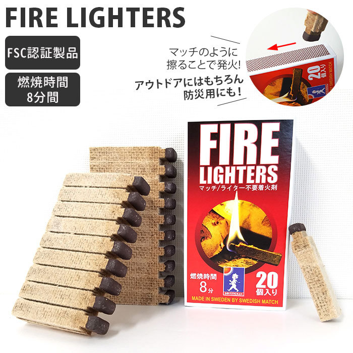 ・箱の中から着火用マッチを1本切り離して取り出し、箱の側面でマッチのように擦ることで発火するFIRE LIGHTERS。 ・マッチやライターなどの火種いらず。1つで2役!場所もとらず経済的。 ・燃焼時間が8分間と長く、着火剤としてBBQ、キャンプファイヤー、薪ストーブ、暖炉にも最適。 ・天然由来の原料を使用していて、揮発性が低く長期保存が可能。FSC認証製品なのもポイント。 ・緊急時にも使用ができるので、防災用バッグに常に忍ばせておきたいアイテム。 ※FSC認証製品とは、「適切に管理された森林」に由来する製品であると保証された環境配慮型の商品のことです。 |