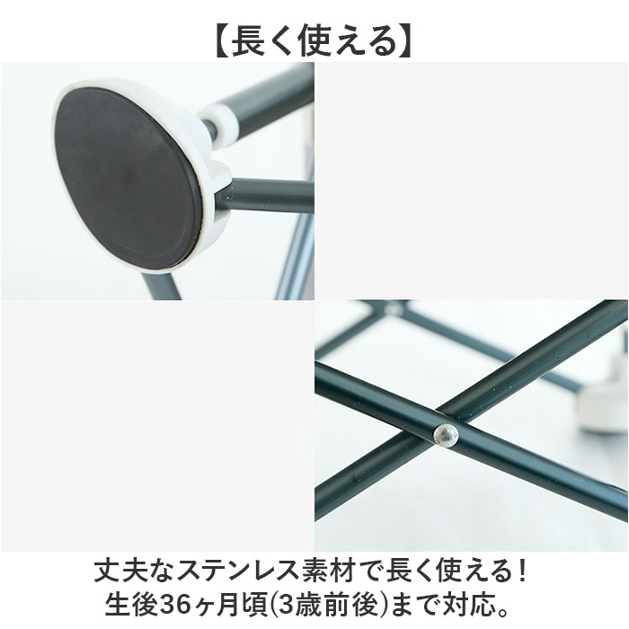 | 【生後6ヶ月から使えるチェア】 ・生後6ヶ月ごろから使えるキッズ用チェアが新発売♪ 【便利な折り畳み式】 ・外食やお出かけ時にも使える便利な折り畳み式。軽量で持ち運びしやすい♪ 【嬉しいテーブル付き】 ・離乳食やマグ、お子さまのおもちゃを置くのに便利なテーブル付き。 【テーブルは取り外し可能】 ・テーブルは取り外しができ、汚れてもサッと水洗いやふき取りがしやすい◎ 【ベルト付きで安心】 ・お子さまが動いても抜け出しにくい3点ロックのベルト付きで安心。 【2WAYで使用可能】 ・そのまま床置きで使うのはもちろん、椅子の上に載せてハイチェアとして使える◎ 【大人の椅子に固定できるベルト】 ・チェアを大人用の椅子に固定できるベルトを2本付属。 【脚底は滑り止め仕様】 ・脚底にはつるつるした座面や床の上でも安心な滑り止め仕様。 【長く使える】 ・丈夫なステンレス素材で長く使える!生後36ヶ月頃(3歳前後)まで対応。 【収納袋付き】 ・携帯、収納に便利な専用の収納袋付き。 |