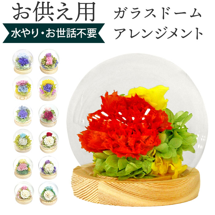 | ・色彩豊かなプリザーブドフラワーをガラス球体に閉じ込めた「スフィア ガラスドームアレンジメント」 【プリザーブドフラワーって?】 ・本物の生花を鮮やかな色彩のまま加工したもので、生花より長期間美しさを鑑賞できるのが特徴。 【生花の美しさと質感がそのまま】 ・季節ごとに咲く花々を、生花のみずみずしい質感はそのままに透明なドームの中にギュッと凝縮。 【水やりやお世話は不要】 ・ガラスドームで覆われているので、お花がホコリで汚れる心配がなく、水やりや水換えも一切不要。 【仏壇のお手入れも手間いらず】 ・お花が枯れずに長持ちするため、仏壇の前棚(ぜんだな)や経机を汚さずにいつでも清潔。 【ナチュラルな木製台座】 ・仏壇や遺影の前にさりげなく飾ることのできる、白木の台座に乗った清楚な外観が好印象。 【インテリアに奥行きをプラス】 ・ドームの中でお花がふんわり浮かんで見えるので、限られた空間でも素敵にディスプレイが可能。 【コンパクトな手のひらサイズ】 ・小ぶりな仏壇にも飾りやすい、手のひらに収まるほどの控え目なサイズ感。ペットの仏壇にも最適。 【大切な方の好きなお花を】 ・季節の風物詩を、気持ち華やぐ彩りで。お気に入りの花が凛と咲き誇る、種類豊富なラインナップ。 【故人の面影に寄り添う彩り】 ・お供えする人の心もホッと安らぐ。故人を偲ぶ気持ちに寄り添う、温もり溢れるアレンジメント。 |