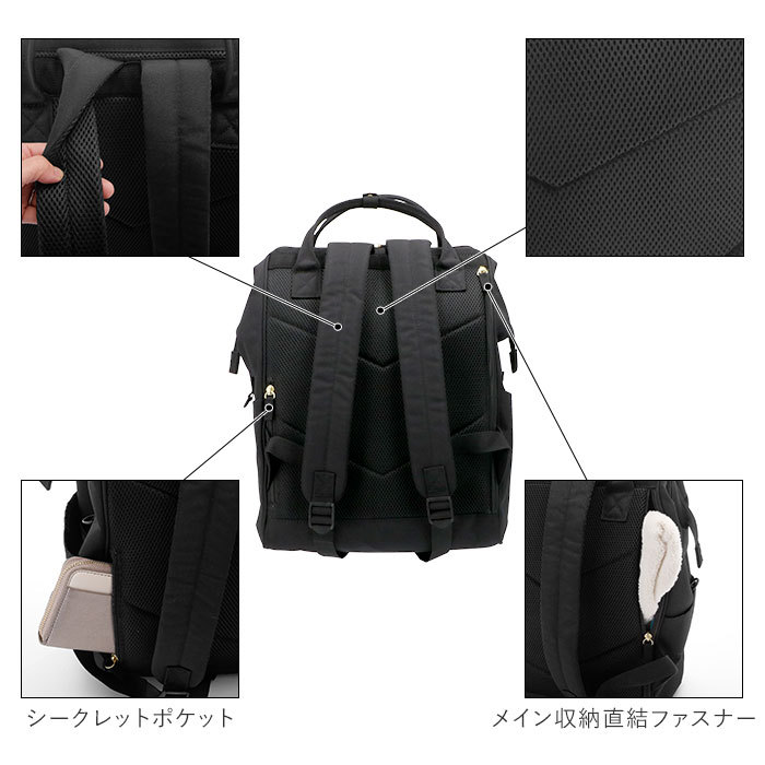 | ・スポーティ&シンプル!anello GRANDEで人気の口金リュックに、軽量&はっ水ポリエステル素材を使用した新モデルが登場! ・ファスナーやリベット等のパーツは全てゴールドカラーで統一。anello GRANDEでは定番のシンプルな杢調生地に映えて、エレガントな雰囲気。 ・メイン収納開口部はワイヤーの入った口金タイプ。ダブルファスナー式で大きく開き、リュックの底に収納した小物まで見渡せて、取り出しやすい♪カラーごとに裏地の色味も違って、見えない所もさりげなくおしゃれ。 ・メイン収納内側には収納ポケット多数!フロント側にオープンポケット×2、ファスナーポケット×1。背面側にも長財布が入る幅広なオープンポケット×1を装備。側面には水筒を立てたまま収納可能なボトルホルダーも。 ・リュック背面にクッション性のあるノートPC&タブレット端末用の収納ポケット。外出先でのPC作業にもスマートに対応できる。 ・フロントのファスナーポケットは、長財布や手帳も余裕で収納できるサイズ♪内側にオープンポケット付き。 ・外側両サイドのオープンポケットには500mlペットボトルや折りたたみ傘が収納可能。キーケースやお気に入りのチャームが取り付けられるリングフックが便利! ・リュック背面右側には、メイン収納に直接アクセスできる縦型ファスナー。左側には長財布など大切なものが収納できるシークレットポケットが付いて、機能性抜群! ・ボディ生地は軽量はっ水素材で、急な雨に濡れた時もサッと水滴を払えば荷物が濡れず安心。しっかりとした持ち手ハンドル付きで、アクティブに持ち運べるのが嬉しい。 |