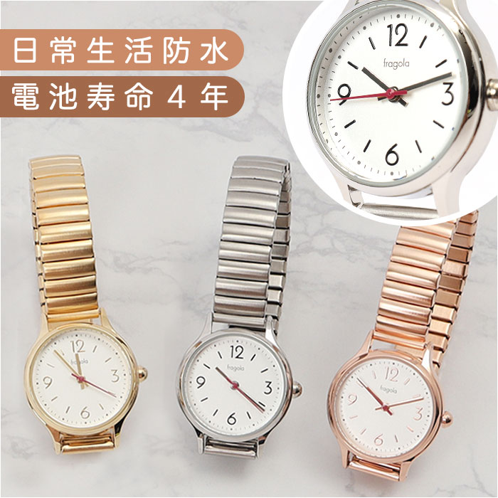 | ・サッと着脱できる!日本製ムーブメントを使用した「fragola ジャバラウォッチ」が新登場。 【ワンタッチ着脱】 ・ゴムのように伸びる「ジャバラベルト」で、誰でも簡単に装着OK!バタバタしがちな出掛けの身支度もスムーズ。 【日常生活防水タイプ】 ・うれしい3気圧防水(日常生活防水)仕様。洗顔や雨で少し水がかかる程度なら大丈夫♪(※プールや海でのご使用は故障の原因となるため、お控えください。) 【シンプルな文字盤】 ・時刻を確認しやすい文字盤デザイン。文字盤ケース横のつまみで、簡単に時刻調節が可能。 【省エネ仕様のムーブメント】 ・電池寿命は約4年!特殊ムーブメントを使用しているから、通常より電池が長持ち。電池交換の手間を軽減◎ 【シンプルなコーデに】 ・女性らしい雰囲気漂う腕時計。アクセサリー感覚で身につけられて、コーデのアクセントにも☆ 【お好みをチョイス】 ・上品な光沢のあるカラーをラインナップ。オン・オフ問わずどんなスタイルとも相性ばっちり。 |