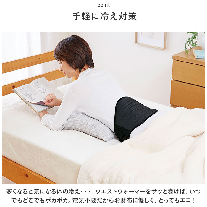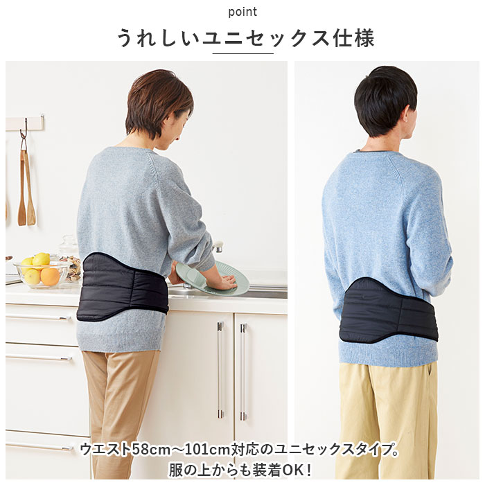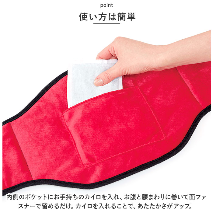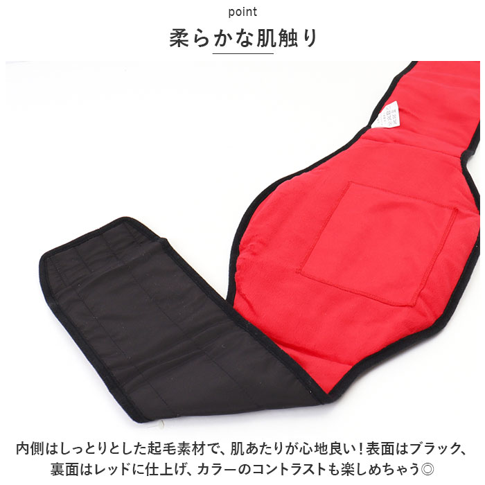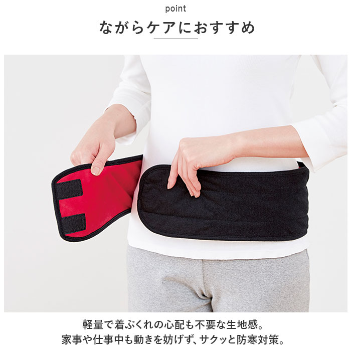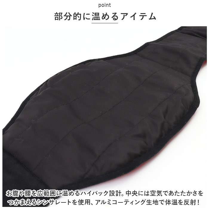 | ・お腹も腰まわりもポカポカ♪寒い季節のお助けアイテム「ホットレスト ウエストウォーマー」が新登場。 【手軽に冷え対策】 ・寒くなると気になる体の冷え・・・。ウエストウォーマーをサッと巻けば、いつでもどこでもポカポカ。電気不要だからお財布に優しく、とってもエコ! 【部分的に温めるアイテム】 ・お腹や腰を広範囲に温めるハイバック設計。中央には空気であたたかさをつかまえるシンサレートを使用、アルミコーティング生地で体温を反射! 【使い方は簡単】 ・内側のポケットにお手持ちのカイロを入れ、お腹と腰まわりに巻いて面ファスナーで留めるだけ。カイロを入れることで、あたたかさがアップ。 【柔らかな肌触り】 ・内側はしっとりとした起毛素材で、肌あたりが心地良い!表面はブラック、裏面はレッドに仕上げ、カラーのコントラストも楽しめちゃう◎ 【うれしいユニセックス仕様】 ・ウエスト58cm〜101cm対応のユニセックスタイプ。服の上からも装着OK! 【お手入れラクラク】 ・汚れが気になったら、自宅で手洗いOK。いつも清潔をキープ。 【ながらケアにおすすめ】 ・軽量で着ぶくれの心配も不要な生地感。家事や仕事中も動きを妨げず、サクッと防寒対策。 |