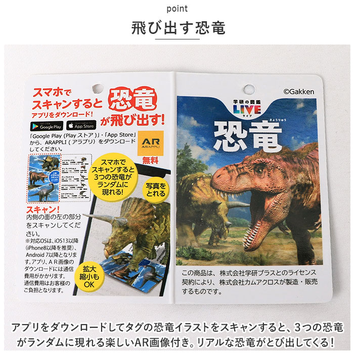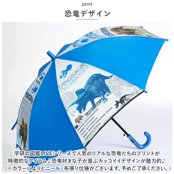 | ・恐竜デザインがユニークなキッズロングアンブレラが新発売♪(親骨50cm) 【恐竜デザイン】 ・学研の図鑑LIVEシリーズで人気のリアルな恐竜たちのプリントが特徴的なアイテム♪恐竜好きな子が喜ぶカッコイイデザインが魅力的♪ (※カラーによりビニール・布張り仕様がございます。予めご了承ください。) 【グラスファイバー骨】 ・傘骨は軽くて丈夫で折れにくいグラスファイバーを使用。 【ジャンプタイプ】 ・上履き入れやサブバッグなど、片手に手荷物を持っている時もワンタッチで開けるジャンプ式! 【留めバンド】 ・ビニール傘タイプはスナップボタン、布張りタイプは面ファスナータイプ。 【飛び出す恐竜】 ・アプリをダウンロードしてタグの恐竜イラストをスキャンすると、3つの恐竜がランダムに現れる楽しいAR画像付き。リアルな恐竜がとび出してくる! |