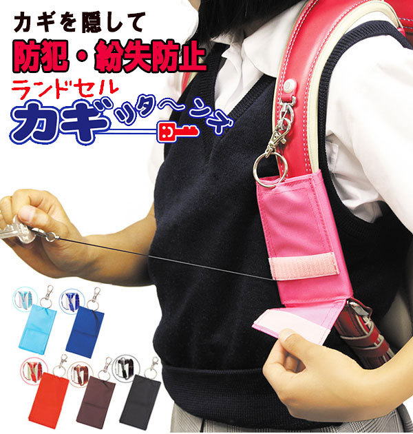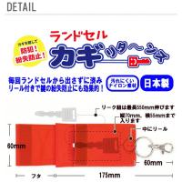 | 安心・安全のキーケース!ランドセルの肩ベルトに本体を巻きつける様に留め、フックをランドセルのDカンに装着するから落ちにくい!収納部分には伸ばせるリール付き。鍵の出し入れもカンタン。使い終わったらすぐに収納できるので鍵を失くす心配もありません。ランドセルの色に合わせた目立ちにくいデザインになっています。 |