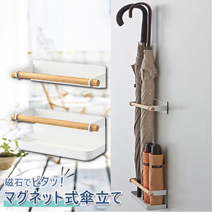| ・磁石でピタッ!シンプルでナチュラルなデザインの、マグネット式傘立てが発売。 ・鉄製のドアや磁石のくっつく場所にカンタン取り付け!あっという間に、コンパクトな収納スペースに変身◎ ・上ホルダーと下ホルダーの間隔を変えると、長傘と折りたたみ傘を同時に収納可能。台座には約1.5cmほどのフチがあり、濡れた傘の収納も安心。 ・冷蔵庫や洗濯機、鉄製の机などに取り付ければ、小物入れとしても活躍。 |