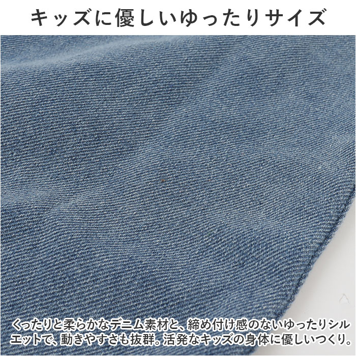 ・くったりと柔らかなデニム素材と、締め付け感のないゆったりシルエットで、動きやすさも抜群。活発なキッズの身体に優しいつくり。