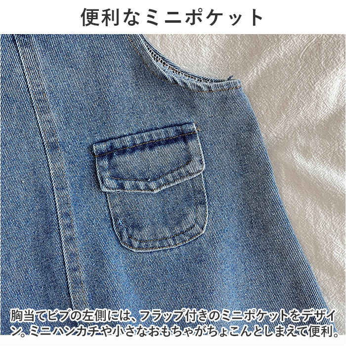 ・胸当てビブの左側には、フラップ付きのミニポケットをデザイン。ミニハンカチや小さなおもちゃがちょこんとしまえて便利。