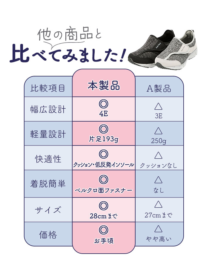 | ・歩きやすさ&履き心地にこだわったメンズスニーカー、「新・あなた想い」が新登場! ・厚めの靴底ソールには、軽量で適度な屈曲性のある合成ゴム底を使用。しっかりとした滑り止め加工で、グリップ感抜群!安定した着地をサポート。 ・足の幅が広めな日本人に合わせた4E幅広設計で、窮屈な締め付け感から解放。さらに足の甲が高めの方でも履きやすいゆったり設計。 ・ベルクロ式(マジックテープ式)で着脱がカンタン!スムーズに脱ぎ履き出来て、ジムやランニング用などスポーツ用にもぴったり。 ・約8mm厚の低反発インソールを使用。かかと部分にもクッション性のある生地を使用して、歩行時の衝撃を和らげて、足や膝への負担を軽減。 ・杢調の合成繊維を使用したアッパーとスタイリッシュなフォルムで、スポーツやウォーキングでの使用はもちろん、カジュアルなファッションにも合わせやすいのが嬉しい。 |