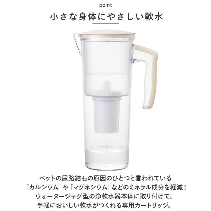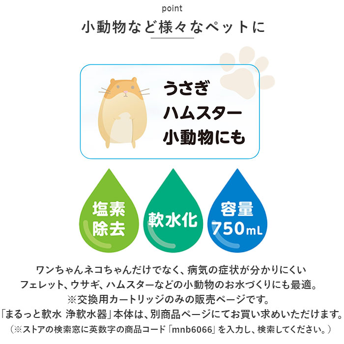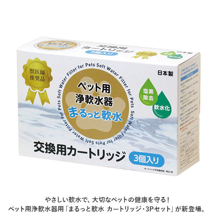 | ・やさしい軟水で、大切なペットの健康を守る!ペット用浄軟水器用「まるっと軟水 カートリッジ・3Pセット」が新登場。 【小さな身体にやさしい軟水】 ・ペットの尿路結石の原因のひとつと言われている「カルシウム」や「マグネシウム」などのミネラル成分を軽減!ウォータージャグ型の浄軟水器本体に取り付けて、手軽においしい軟水がつくれる専用カートリッジ。 【水道水をまるっと軟水化】 「まるっと軟水」のカートリッジが、イオン交換樹脂の力で水道水に含まれる余分なミネラルを除去することで、水道水がペットに優しい軟水に変化。 【残留塩素も除去】 ・カートリッジ内の活性炭が水道水中の遊離残留塩素もしっかりと除去。塩素臭のないおいしい水がつくれる! 【使い方は簡単3ステップ!】 1.肉球マークの刻まれたフタを外し、「まるっと軟水」本体上部の貯水槽にカートリッジを取り付け、水道水を入れる。 2.フタを取り付け、水が全て本体容器に落ちるのを待ちます。(※ろ過時間は約5分〜10分程度) 3.ろ過されたお水を、水飲み容器に注ぐだけ! 【たっぷり使える3パックセット】 ・カートリッジの交換目安は約2か月。(※カートリッジの交換時期は、お使いの地域の水質や使用頻度などによって異なります。) 【小動物など様々なペットに】 ・ワンちゃんネコちゃんだけでなく、病気の症状が分かりにくいフェレット、ウサギ、ハムスターなどの小動物用のお水づくりにも最適。 ・※交換用カートリッジのみの販売ページです。「まるっと軟水 浄軟水器」本体は、別商品ページにてお買い求めいただけます。(※ストアの検索窓に英数字の商品コード「mnb6066」を入力し、検索してください。) |