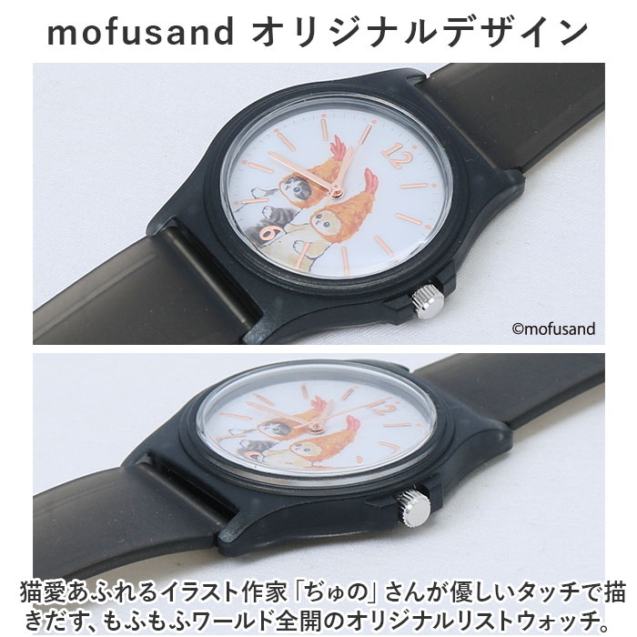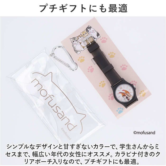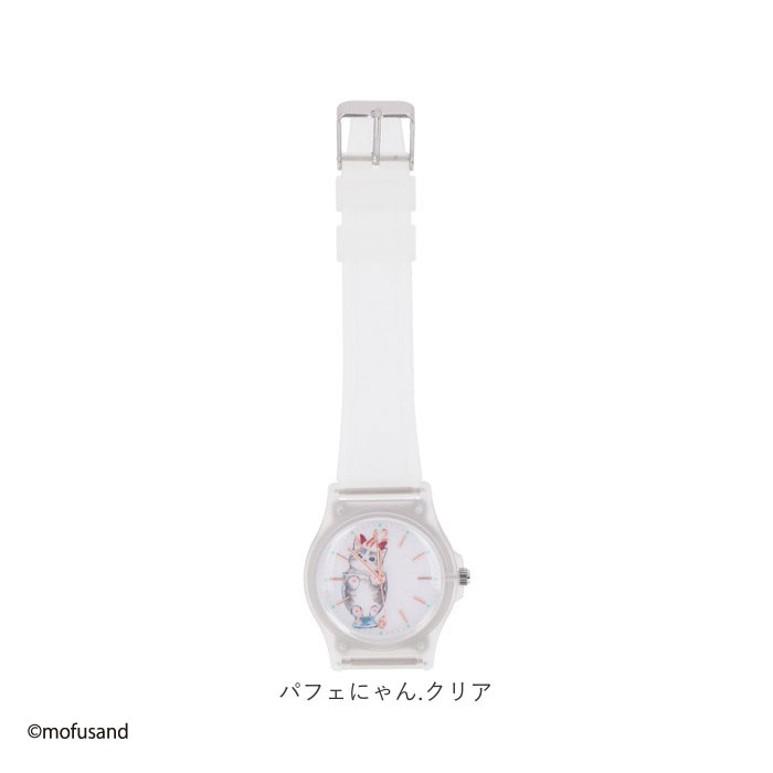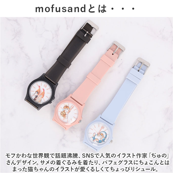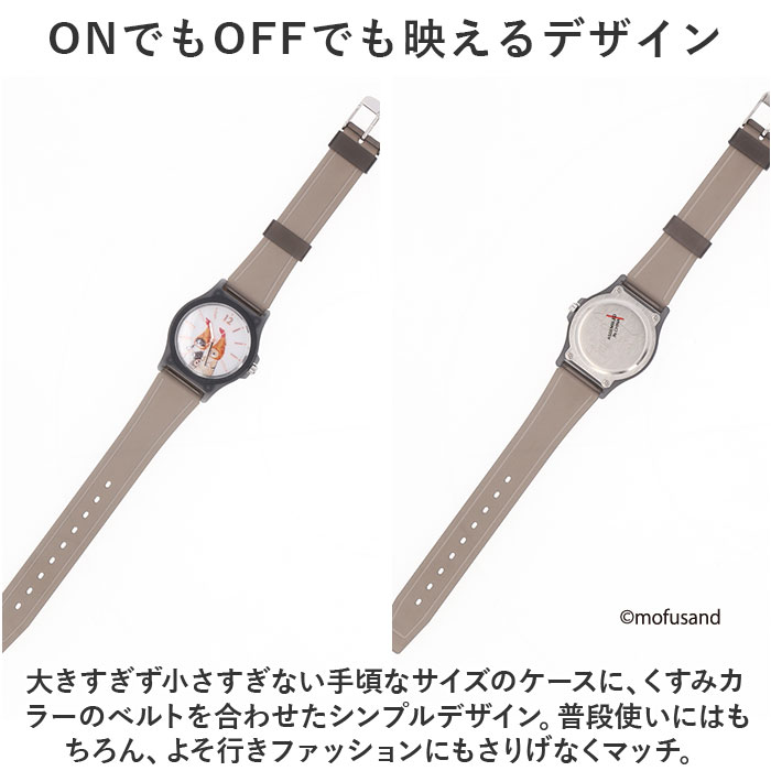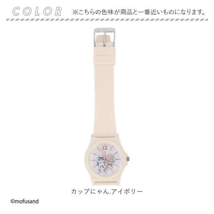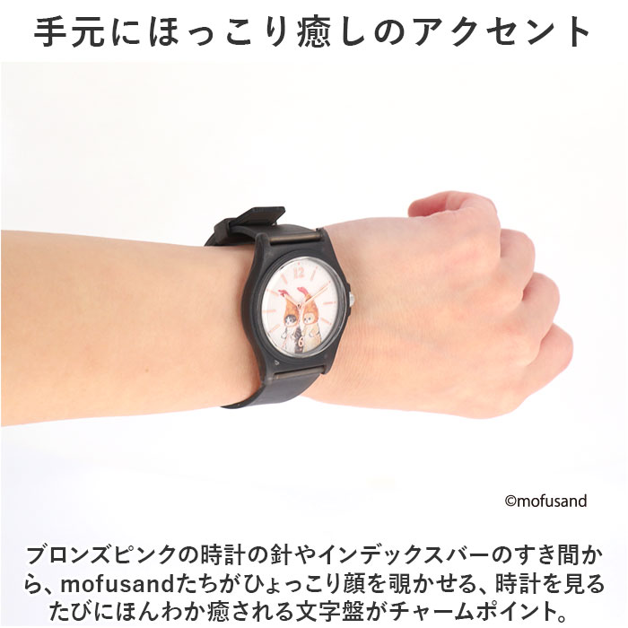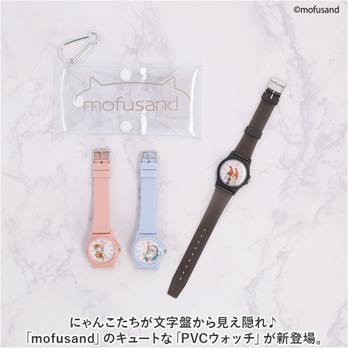 | ・にゃんこたちが文字盤から見え隠れ♪「mofusand 」のキュートな「PVCウォッチ」が新登場。 【mofusand オリジナルデザイン】 ・猫愛あふれるイラスト作家「ぢゅの」さんが優しいタッチで描きだす、もふもふワールド全開のオリジナルリストウォッチ。 【ONでもOFFでも映えるデザイン】 ・大きすぎず小さすぎない手頃なサイズのケースに、くすみカラーのベルトを合わせたシンプルデザイン。普段使いにはもちろん、よそ行きファッションにもさりげなくマッチ。 【手元にほっこり癒しのアクセント】 ・ブロンズピンクの時計の針やインデックスバーのすき間から、mofusandたちがひょっこり顔を覗かせる、時計を見るたびにほんわか癒される文字盤がチャームポイント。 【腕元が華やぐベルトカラー】 ・華奢な手首にさりげなく映えるベルトは、肌に柔らかくフィットして、汚れや汗もサッと拭き取れるポリウレタン素材(※1)。肌馴染みのよいくすみカラーも魅力のひとつ(※2)。 【プチギフトにも最適】 ・シンプルなデザインと甘すぎないカラーで、学生さんからミセスまで、幅広い年代の女性にオススメ。カラビナ付きのクリアポーチ入りなので、プチギフトにも最適。 【アクセサリ感覚でハンギング】 ・クリアポーチに付属したカラビナで、バッグのハンドルやパンツのベルトループに引っ掛ければ、ファッションの素敵なアクセントに。 【mofusandとは・・・】 ・モフかわな世界観で話題沸騰、SNSで人気のイラスト作家「ぢゅの」さんデザイン。サメの着ぐるみを着たり、パフェグラスにちょこんとはまった猫ちゃんのイラストが愛くるしくてちょっぴりシュール。 |