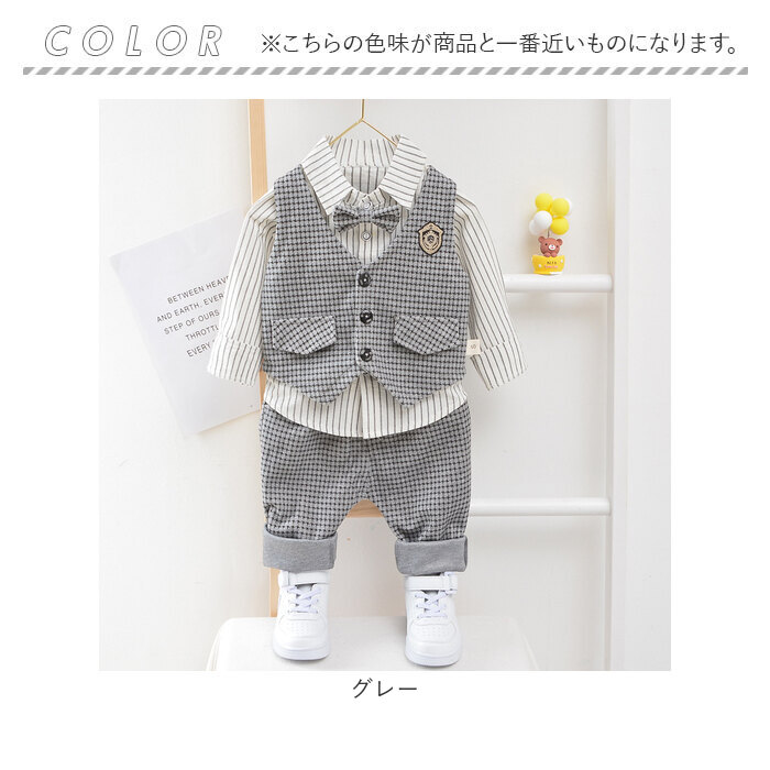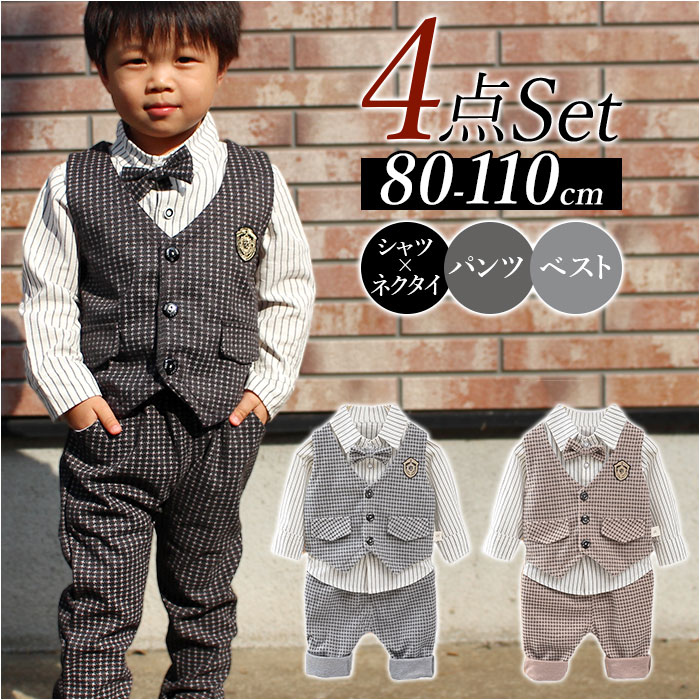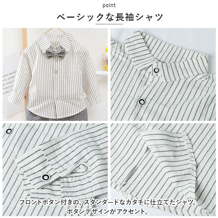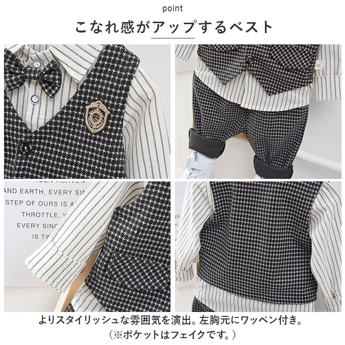・長袖シャツ、ベスト、ロングパンツ、蝶ネクタイの4点セット。大人顔負けのスタイリングが完成☆