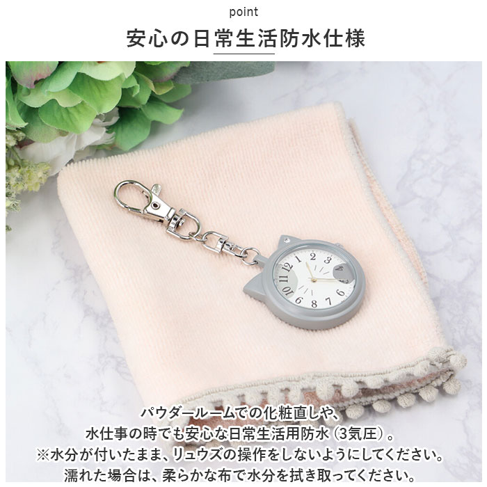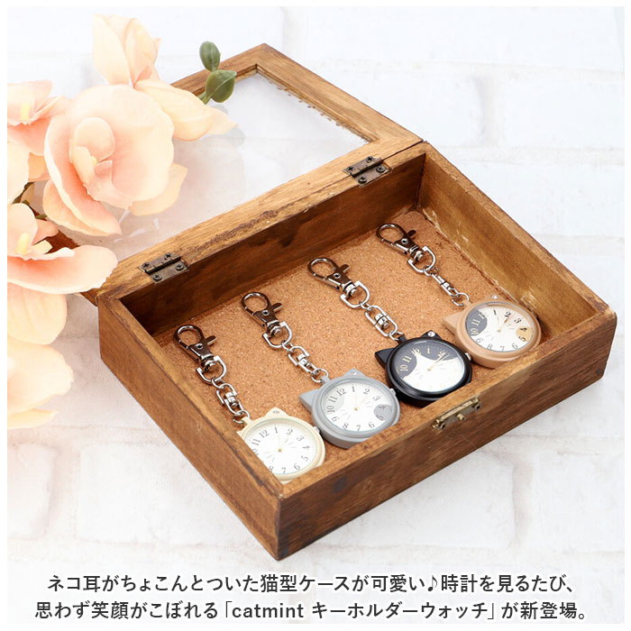 | ・ネコ耳がちょこんとついた猫型ケースが可愛い♪時計を見るたび、思わず笑顔がこぼれる「catmint キーホルダーウォッチ」が新登場。 【カジュアルなハンギングウォッチ】 ・チェーンでつながれたナスカンフックで、バッグのハンドルやベルト通しなどに引っ掛けて使える、どことなくコミカルな雰囲気が魅力のハンギングウォッチ。 【シンプルな文字盤デザイン】 ・ホワイトのすっきりとした文字盤にインデックス数字を放射状に散りばめた、シンプルで見やすいアナログウォッチフェイス。ゴールドの時計の針の両脇に並んだ6本のおヒゲがチャームポイント。 【安心の日常生活防水仕様】 ・パウダールームでの化粧直しや、水仕事の時でも安心な日常生活用防水(3気圧)。(※水分が付いたまま、リュウズの操作をしないようにしてください。濡れた場合は、柔らかな布で水分を拭き取ってください。) 【日本製ムーブメント】 ・静かに正確な時を刻む。確かな性能を誇る、安心と信頼の日本製ムーブメントを採用。 【プチギフトに最適】 ・片方の猫耳でラインストーンがキラリと輝きを放つ、大人可愛さとフェミニンさが同居したデザイン。お世話になったあの方や、お友だちへのプチギフトにも最適。 【選べるキャットフェイス】 ・ミケネコ、ブチに、シロネコ、ハチワレ。お気に入りの子はどの子?ニャンコの可愛らしい魅力をギュッと詰め込んだ、ネコ好きさん必携のウォッチアクセサリ。 |