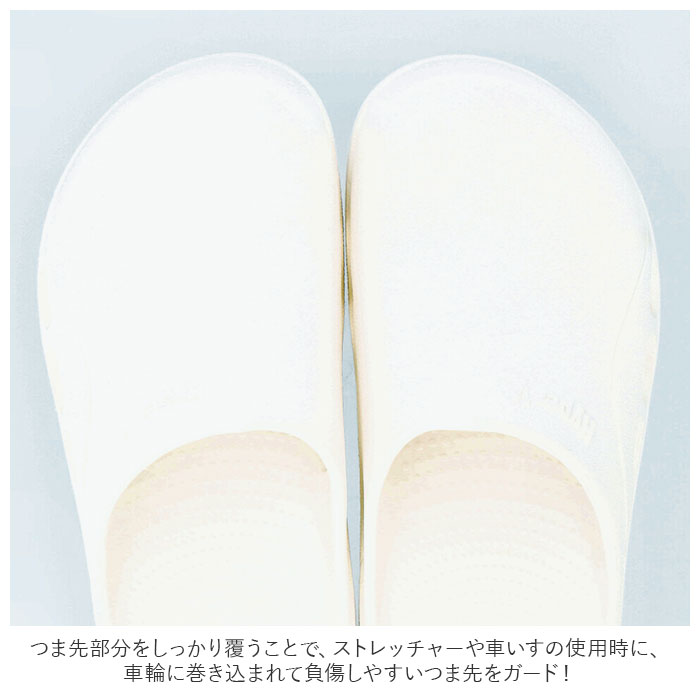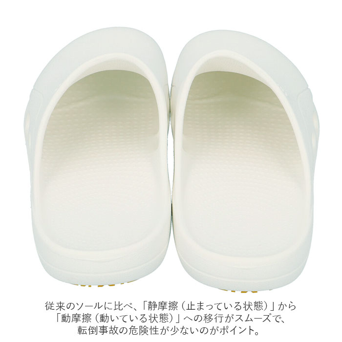 | ・驚異のグリップ力!入浴介助に最適なpitatto III(ピタットスリー)に、入浴介護用サンダルが登場。 ・高い耐滑性能を誇る「ハイパーVソール」を採用!水・油・石けん水等で濡れた路面、床等でその効果を発揮! ・従来のソールに比べ、「静摩擦(止まっている状態)」から「動摩擦(動いている状態)」への移行がスムーズで、転倒事故の危険性が少ないのがポイント。 ・ハイパーVソール底面に刻まれた特殊なV字で、タテ・ヨコ・ナナメ、全方向で滑りにくい構造。 ・アッパー部分には水や汚れに強いEVA素材を使用。クッション性が高く軽量で、足への負担を軽減。 ・足のかたちに合わせ斜めにカットした、オブリーク形状。つま先にゆとりがあり、足先が痛くなりにくいつくり。 ・転倒の原因のひとつである「つまずき」に対し、つま先をあげることで引っかかりにくいトゥアップ設計!歩きやすさも抜群。 ・つま先部分をしっかり覆うことで、ストレッチャーや車いすの使用時に、車輪に巻き込まれて負傷しやすいつま先をガード! ・両サイドに、靴内部の水を排出する水抜け穴を配置◎ ・サッと脱ぎ履きできるサンダルタイプ。入浴介助だけでなくあらゆる介護現場で活躍! |