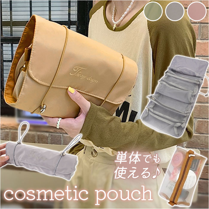 ・クルっと丸めれば、コンパクトに♪たっぷり入って持ち運びに便利な「トラベル用コスメポーチ」 ・ぐ〜んと伸びるゴムバンドを外してフラップを開くと、内側にファスナー付きのワイドポーチ×2個、スリムポーチ×2個を搭載したユニークな構造。 ・ワイドポーチとスリムポーチともに、目の細かいメッシュ生地で出来ているため、収納したコスメが一目瞭然。使いたい物を一瞬でサッと取りだせるのが使いやすさのポイント! 4つの小さなポーチは、トラベルポーチ本体から面ファスナーで切り離すことができ、それぞれ単体のコスメポーチとしても使用可能。 ・ワイドポーチには化粧水ボトルやスプレーがすっぽり。スリムポーチにはリップスティックやポリッシュ、コンパクトやメイクブラシなど細々としたツールを小分けにしておくのに便利。 ・旅行先ではゴムバンドをパウダールームのフックなどに掛ければ、壁掛けポーチに変身。 ・かさばるコスメ類もクルっと丸めてひとまとめに。ゴムバンドでパチンッと留めれば、旅行カバンの中で小物が散らばらないから安心!(※バンドはバックル金具で締め付け具合を調節できます。) |