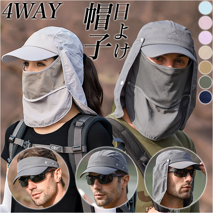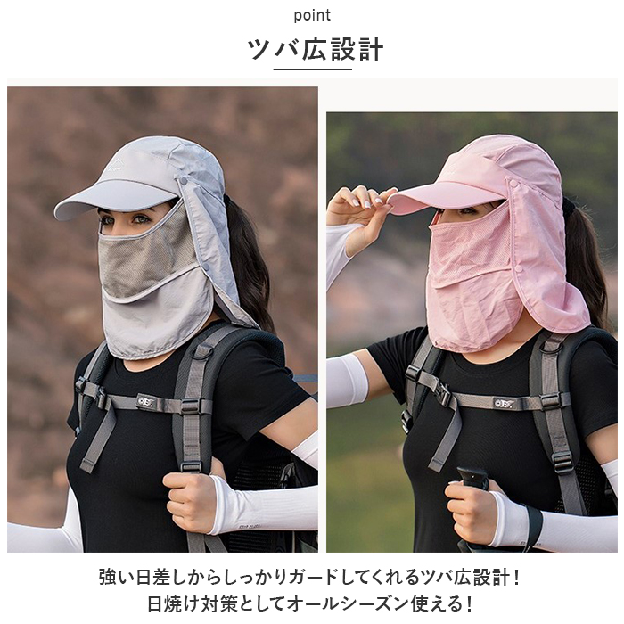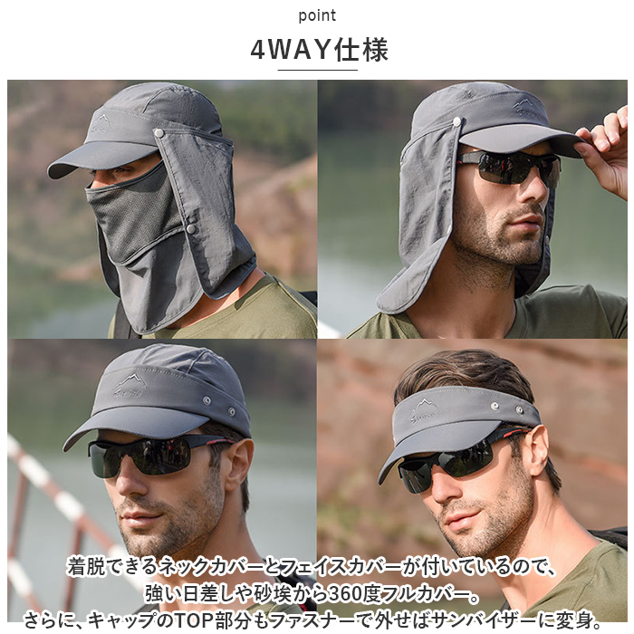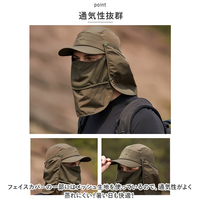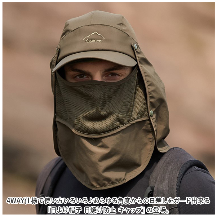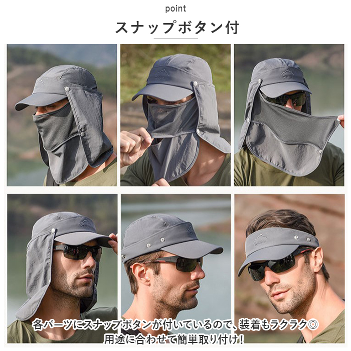 | ・4WAY仕様で使い方いろいろ♪あらゆる角度からの日差しをガード出来る「日よけ帽子 日焼け防止 キャップ」の登場。 【4WAY仕様】 ・着脱できるネックカバーとフェイスカバーが付いているので、強い日差しや砂埃から360度フルカバー。さらに、キャップのTOP部分もファスナーで外せばサンバイザーに変身。シーン合わせてスタイルをチョイス☆ 【スナップボタン付】 ・各パーツにスナップボタンが付いているので、装着もラクラク◎用途に合わせて簡単取り付け! 【ツバ広設計】 ・強い日差しからしっかりガードしてくれるツバ広設計!日焼け対策としてオールシーズン使える! 【通気性抜群】 ・フェイスカバーの一部にはメッシュ生地を使っているので、通気性がよく蒸れにくい!暑い日も快適! 【吸汗帯付き】 ・内側は吸汗速乾性に優れた生地仕様なので、汗をかいてもすぐ乾くのもうれしいポイント☆ 【サイズ調整可能】 ・後部にある面ファスナーでしっかり自分サイズに調節ができる! 【折りたたみOK】 ・小さく折りたたんでカバンに収納できるので、旅行やアウトドアなどでも大活躍☆ 【豊富なカラー】 ・カラーバリエーションが豊富なので、ユニセックスで使える!カップルや家族で色違いやお揃いで購入するのもGOOD♪ |