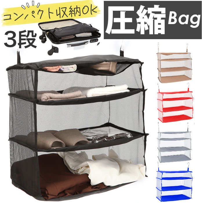 | ・旅行や出張で必要な衣類などをコンパクトにまとめて収納♪圧縮バッグが登場。 【3段収納】 ・3層に分かれたメッシュ仕様の収納ルーム。シンプルな形状なので、お家の中の吊り下げ収納にも使えて便利。 【オープンポケット付き】 ・最上段にオープンポケットが2つ付いており、洗面用品など細かい物も分けて収納可能! 【圧縮収納】 ・アコーディオンのような形になっていて、グッと押すだけで圧縮されてコンパクトに♪ 【吊り下げ収納】 ・宿泊先でのクローゼットのパイプにフックを吊るして使えば、棚のように広がり旅先での荷物の整理もラクラク! 【荷物をひとまとめ】 ・トランクケースやキャリーバッグの中でごちゃつかず、簡単に荷物をスッキリひとまとめ。バッグ一つで上着からボトムスまで収納できる優れもの! |