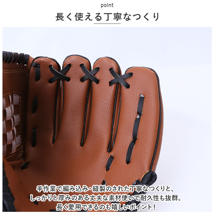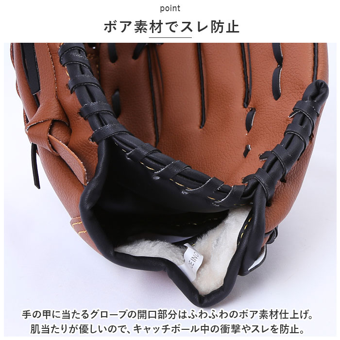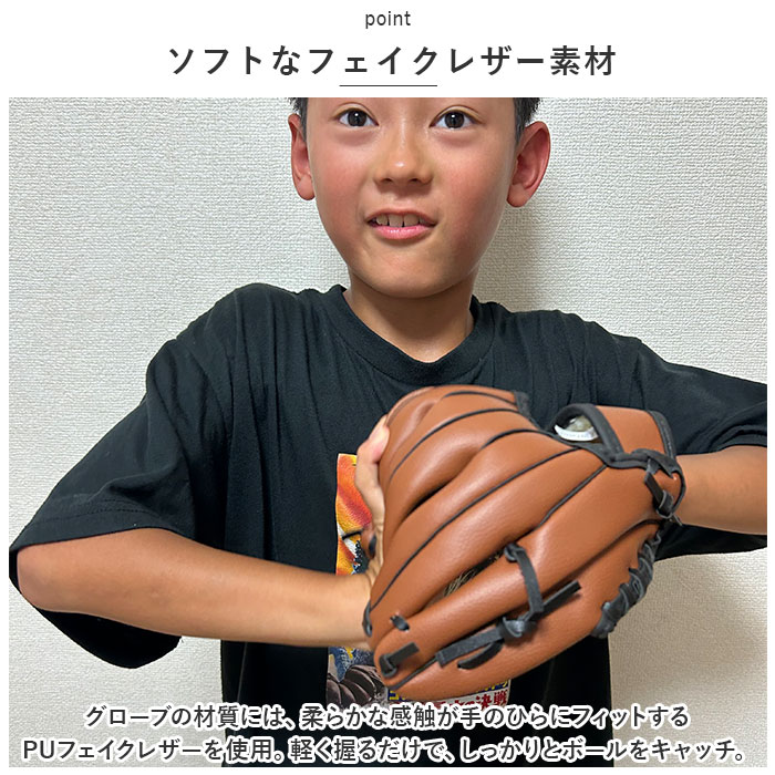 | ・週末のパパとのキャッチボールや、草野球が大好きなキッズにぴったり!使い込むほどに手のひらに馴染む「キッズ用野球グローブ」 【ソフトなフェイクレザー素材】 ・グローブの材質には、柔らかな感触が手のひらにフィットするPUフェイクレザーを使用。軽く握るだけで、しっかりとボールをキャッチ。 【ボア素材でスレ防止】 ・手の甲に当たるグローブの開口部分はふわふわのボア素材仕上げ。肌当たりが優しいので、キャッチボール中の衝撃やスレを防止。 【長く使える丁寧なつくり】 ・手作業で編み込み・縫製のされた丁寧なつくりと、しっかりと厚みのある丈夫な素材使いで耐久性も抜群。長く愛用できるのも嬉しいポイント! 【成長に合わせて選べるサイズ】 ・パパとキャッチボールを始めたばかりの5〜6歳から小学校低学年くらいまでのお子さまには「9.5インチタイプ」。リトルリーグで活躍する小学校中学年から高学年くらいのキッズには「10.5インチタイプ」がオススメ。(※ご購入前にサイズをよくご確認ください。) 【プレゼントにも最適】 ・これから野球を始められるお子さまやお孫さまへのプレゼントに最適!デリケートなキッズの手を優しく守るグローブデビューに最適の逸品。 |
