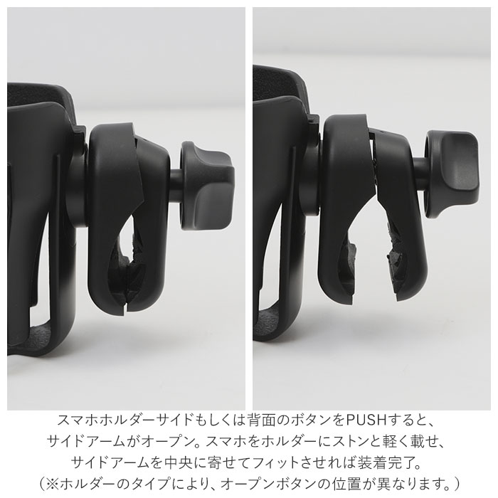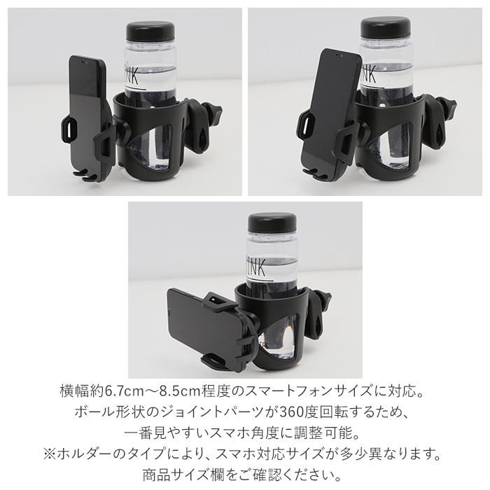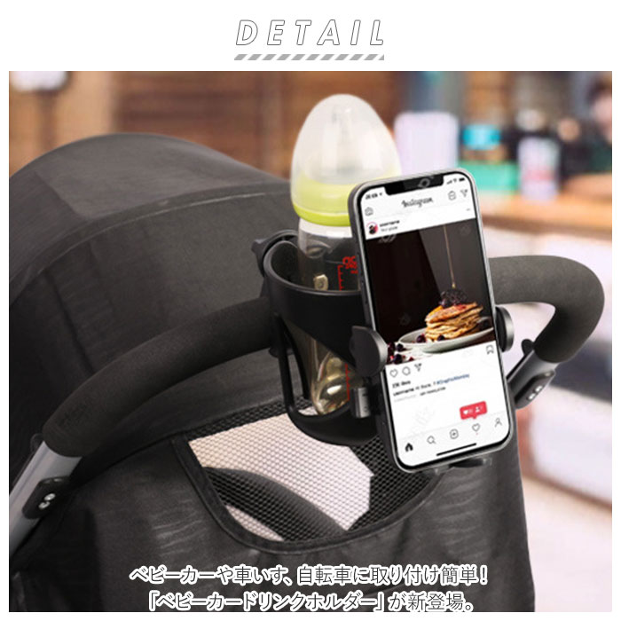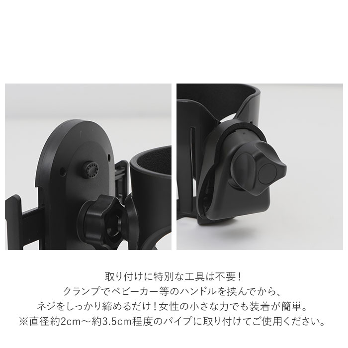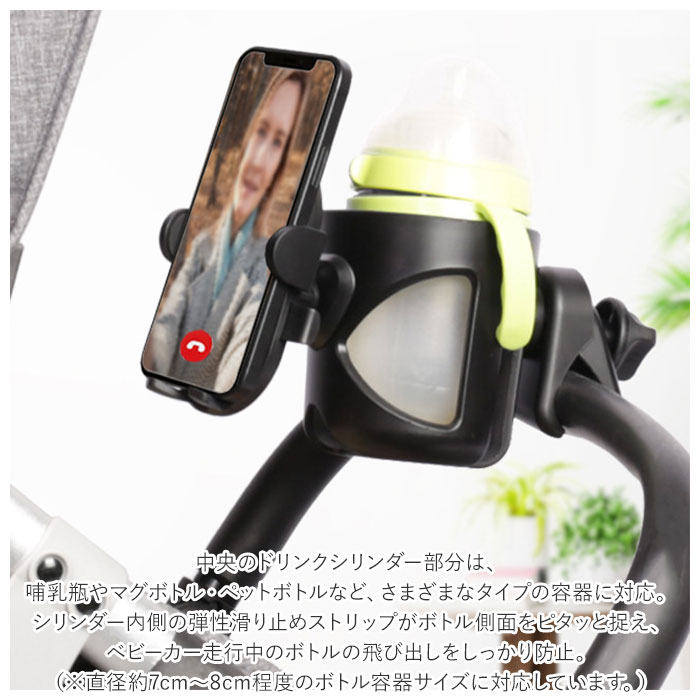 | ・ベビーカーや車いす、自転車に取り付け簡単!「ベビーカードリンクホルダー」が新登場。 ・中央のドリンクシリンダー部分は、哺乳瓶やマグボトル・ペットボトルなど、さまざまなタイプの容器に対応。 ・シリンダー内側の弾性滑り止めストリップがボトル側面をピタッと捉え、ベビーカー走行中のボトルの飛び出しをしっかり防止。(※直径約7cm〜8cm程度のボトル容器サイズに対応しています。) ・背面の取り付けクランプは、360度自由に角度調節が可能。ベビーカーのハンドルはもちろん、自転車のハンドルや車いすの手すり・歩行カートなど、ビークルの種類にかかわらず、多彩なシーンで大活躍! ・取り付けに特別な工具は不要!クランプでベビーカー等のハンドルを挟んでから、ネジをしっかり締めるだけ!女性の小さな力でも装着が簡単。(※直径約2cm〜約3.5cm程度のパイプに取り付けてご使用ください。) ・ドリンクシリンダーのフロントには、移動中もハンズフリーでスマホが楽しめるスマホホルダー付き。 ・スマホホルダーサイドもしくは背面のボタンをPUSHすると、サイドアームがオープン。スマホをホルダーにストンと軽く載せ、サイドアームを中央に寄せてフィットさせれば装着完了。(※ホルダーのタイプにより、オープンボタンの位置が異なります。) ・横幅約6.7cm〜8.5cm程度のスマートフォンサイズに対応。ボール形状のジョイントパーツが360度回転するため、一番見やすいスマホ角度に調整可能。(※ホルダーのタイプにより、スマホ対応サイズが多少異なります。商品サイズ欄をご確認ください。) ・ベビーと一緒のお散歩、ドリンク片手でのお出掛けがより快適になるお役立ちアイテム! |