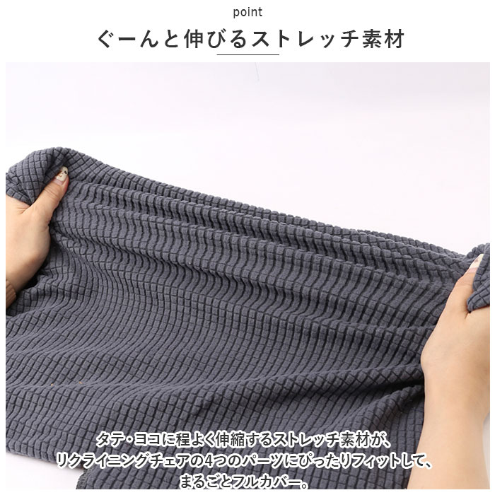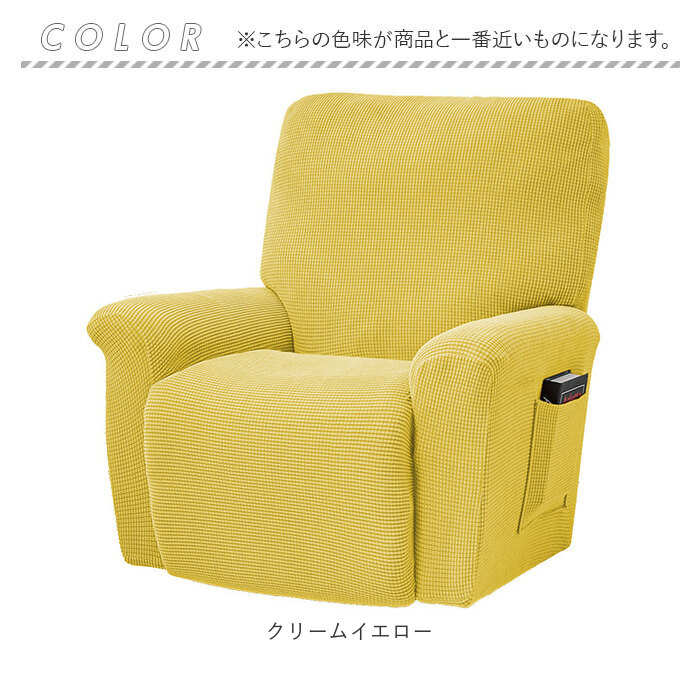 | ・すっぽり被せて、リクライニングソファをリニューアル!誰でもキレイに着せ替えられる「1人掛け用リクライニングソファカバー・4点セット」 【ぐーんと伸びるストレッチ素材】 ・タテ・ヨコに程よく伸縮するストレッチ素材が、リクライニングチェアの4つのパーツにぴったりフィットして、まるごとフルカバー。 【パーツにフィットする4ピース構成】 ・背もたれカバー×1枚、座面カバー×1枚、ひじ掛けカバー×2枚。合計4枚のカバーをリクライニングチェアのそれぞれのパーツに装着する4ピース構成。 【便利なミニポケット付き】 ・左側面用のひじ掛けカバーには、スマホやテレビのリモコンをちょい置きするのにちょうどいいミニポケット付き。 【お部屋に馴染むワッフル生地】 ・生地表面にはふんわりワッフル状の凹凸加工を施し、優しい肌触り。柔らかな素材感と、お部屋のイメージに合わせて選べる豊富なカラーも魅力のひとつ。 【お子さまやペットのいるご家庭に】 ・お子さまの食べこぼし汚れや、ネコちゃんの爪とぎ跡でくたびれてしまったリクライニングソファを簡単イメージチェンジ!汚れが気になったら手軽にお洗濯ができるのも嬉しいポイント。 【選べるカラーでリフレッシュ】 ・インテリアにマッチするカラーで模様替えすれば、お部屋も気持ちもリフレッシュ!家庭用のリクライニングソファだけでなく、オフィスやショップなど来客用ソファのリニューアルにもオススメ。 【セット内容】 ・背もたれカバー×1枚、座面カバー×1枚 ・ひじ掛けカバー×2枚(うち1枚はポケット付き、1枚はリクライニングレバー用スリット付き) |