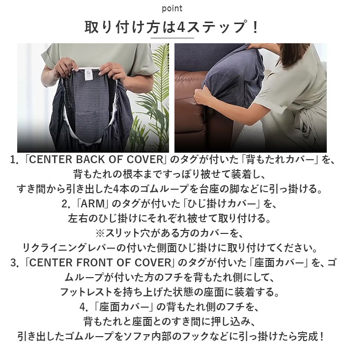 | 【取り付け方は4ステップ!】 1.「CENTER BACK OF COVER」のタグが付いた「背もたれカバー」を、背もたれの根本まですっぽり被せて装着し、すき間から引き出した4本のゴムループを台座の脚などに引っ掛ける。 2.「ARM」のタグが付いた「ひじ掛けカバー」を、左右のひじ掛けにそれぞれ被せて取り付ける。(※スリット穴がある方のカバーを、リクライニングレバーの付いた側面ひじ掛けに取り付けてください。) 3.「CENTER FRONT OF COVER」のタグが付いた「座面カバー」を、ゴムループが付いた方のフチを背もたれ側にして、フットレストを持ち上げた状態の座面に装着する。 4.「座面カバー」の背もたれ側のフチを、背もたれと座面とのすき間に押し込み、引き出したゴムループをソファ内部のフックなどに引っ掛けたら完成! ※海外輸入品のため、商品によってはパッケージや説明書が、英語や中国語表記となっている場合があります。商品を安価でご提供させていただくため、輸入時のパッケージのままでのお届けとなります。予めご了承くださいませ。 ※商品の写真はできる限り実物のお色に近づけるように加工しておりますが、お使いのモニター設定、お部屋の照明などにより、実際の商品と異なる場合がございます。 ※商品の生産時期などにより、付属品(ボタン、ファスナー、タグ、パッケージなど)のデザインや仕様の一部が変更になる場合がございますが、予めご了承くださいませ。 ※商品や個体差などにより、表記と若干異なる場合がございますが、予めご了承くださいませ。 ※輸入品のため、糸の継ぎ目や縫製等が甘い部分、糊跡等が生じる場合がございますが、予めご了承くださいませ。 ※生地の特性上、やや匂いが強く感じられるものもございます。数日のご使用や陰干しなどで気になる匂いはほとんど感じられなくなります。 ※お手入れなどはタグなどの表記をご確認ください。 ※配送の方法によっては、商品に多少のシワ等ができる場合がございますが、出来る限りお客様にリーズナブルな価格帯でご提供するためです。ご了承くださいませ。 ※採寸方法の違いにより、多少の誤差がある場合がございます。 こちらの商品本体、及び商品についている印字やタグに関しては、海外メーカー独自のサイズ情報や表記になります。実際には、当社にて日本向けに正しい情報をページに掲載させて頂いております。 |