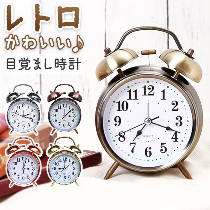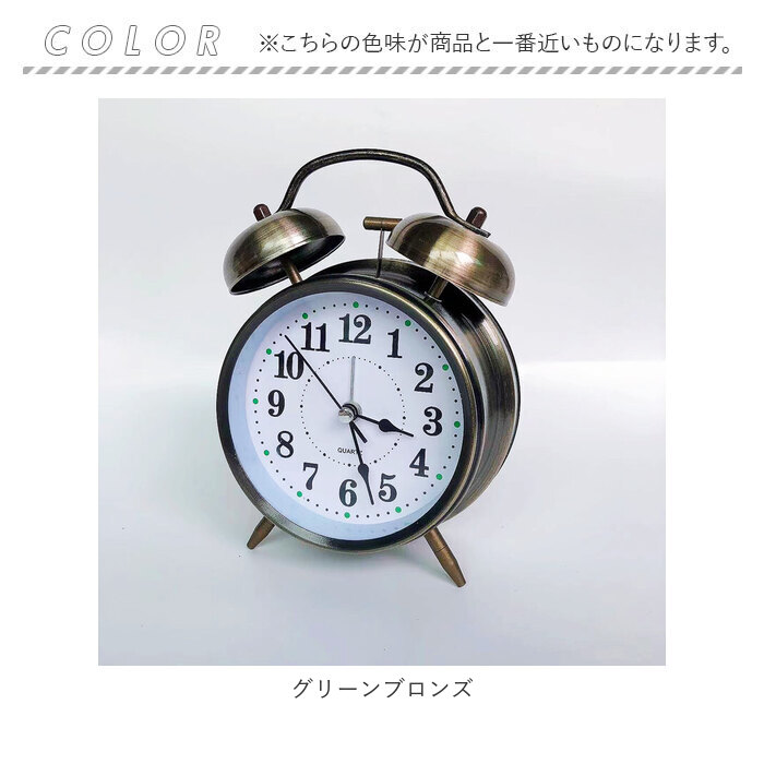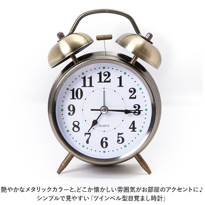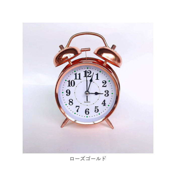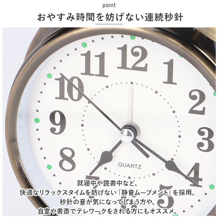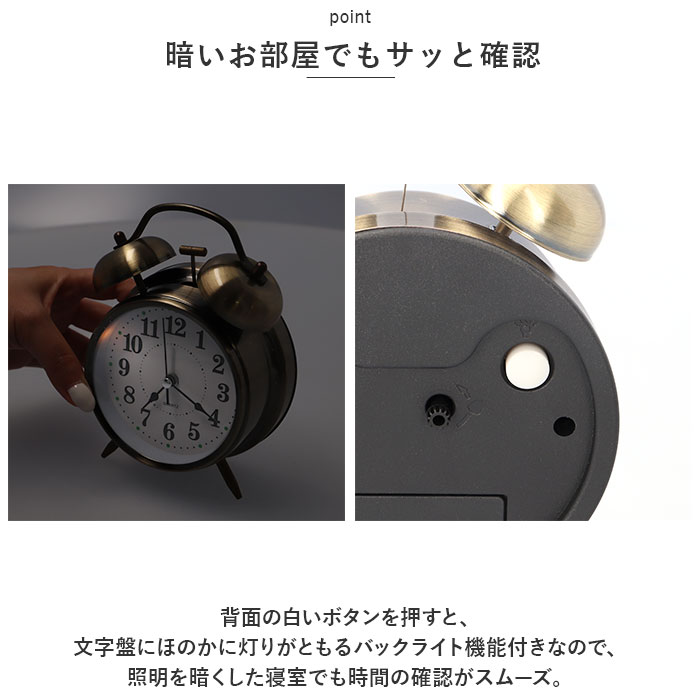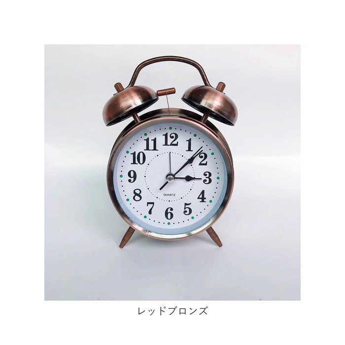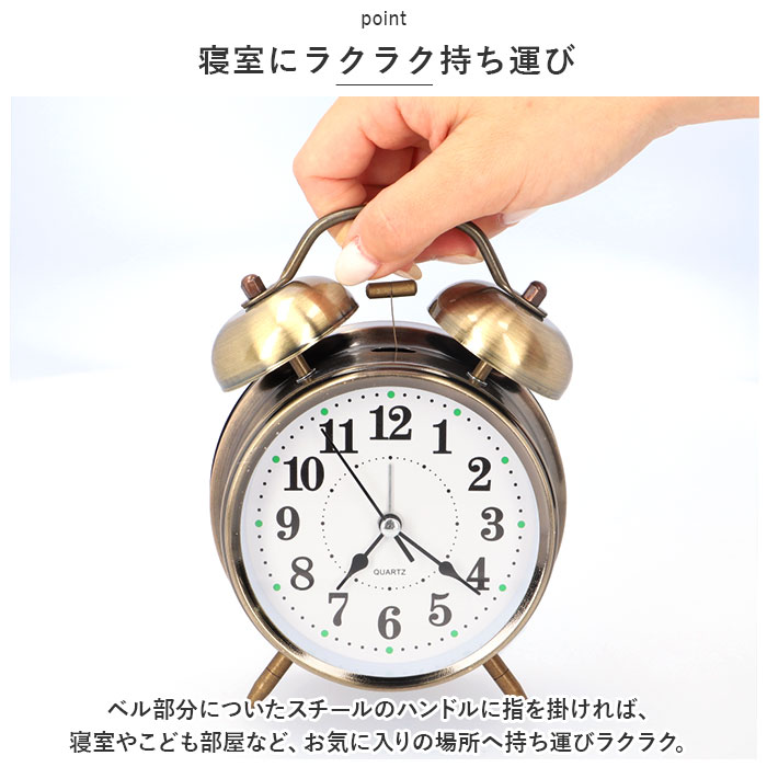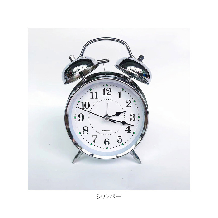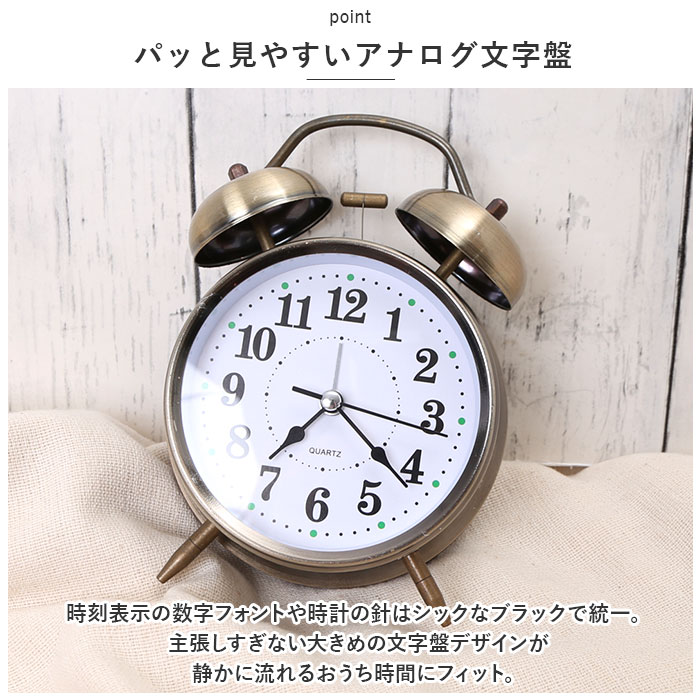 | ・艶やかなメタリックカラーと、どこか懐かしい雰囲気がお部屋のアクセントに♪シンプルで見やすい「ツインベル型目覚まし時計」 【レトロなベル型クロック】 ・コロンと可愛らしい丸型の文字盤に、2つのベルを頭に乗せたアンティーク感のあるデザインが印象的なアラームクロック。 【パッと見やすいアナログ文字盤】 ・時刻表示の数字フォントや時計の針はシックなブラックで統一。主張しすぎない大きめの文字盤デザインが静かに流れるおうち時間にフィット。 【アラームですっきりウェイクアップ】 ・「ジリリリッ」と鳴り響くレトロなベル音の大音量アラームで、早起きの苦手なお寝坊さんでも毎朝の目覚めがスッキリ爽快。(※アラーム時刻設定用の目盛りは12分単位になります。アラーム設定をする際にお気をつけください。) 【おやすみ時間を妨げない連続秒針】 ・就寝中や読書中など、快適なリラックスタイムを妨げない「静音ムーブメント」を採用。秒針の音が気になってしまう方や、自室や書斎でテレワークをされる方にもオススメ。 【暗いお部屋でもサッと確認】 ・背面の白いボタンを押すと、文字盤にほのかに灯りがともるバックライト機能付きなので、照明を暗くした寝室でも時間の確認がスムーズ。 【寝室にラクラク持ち運び】 ・ベル部分についたスチールのハンドルに指を掛ければ、寝室やこども部屋など、お気に入りの場所へ持ち運びラクラク。 【ご家族みんなで使いやすい♪】 ・シンプルで誰にでも使いやすく、お仕事で毎朝早起きされる方や、お子さまの目覚まし用に最適!(※単3形乾電池1本使用。電池は別売りです。) |