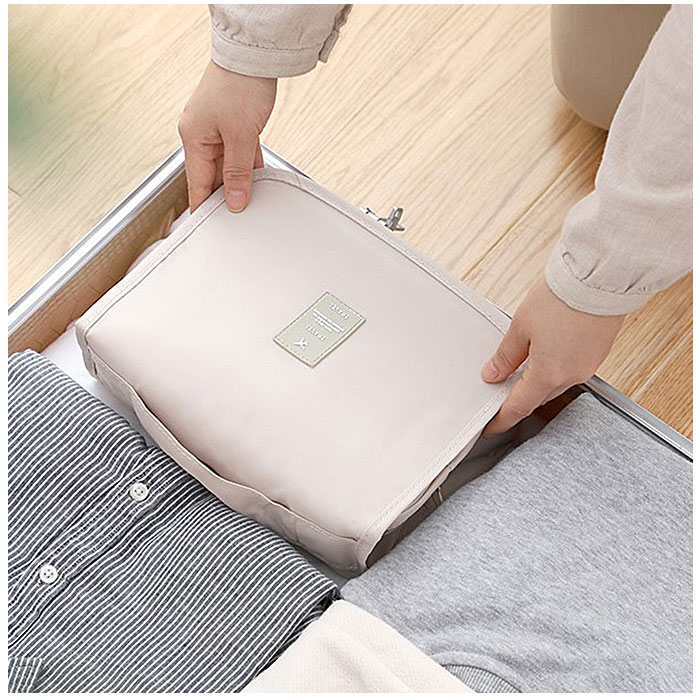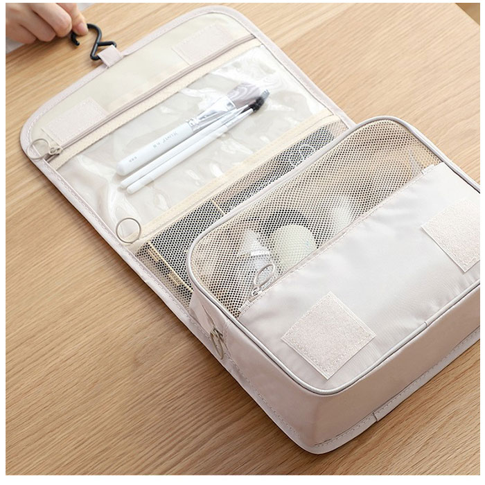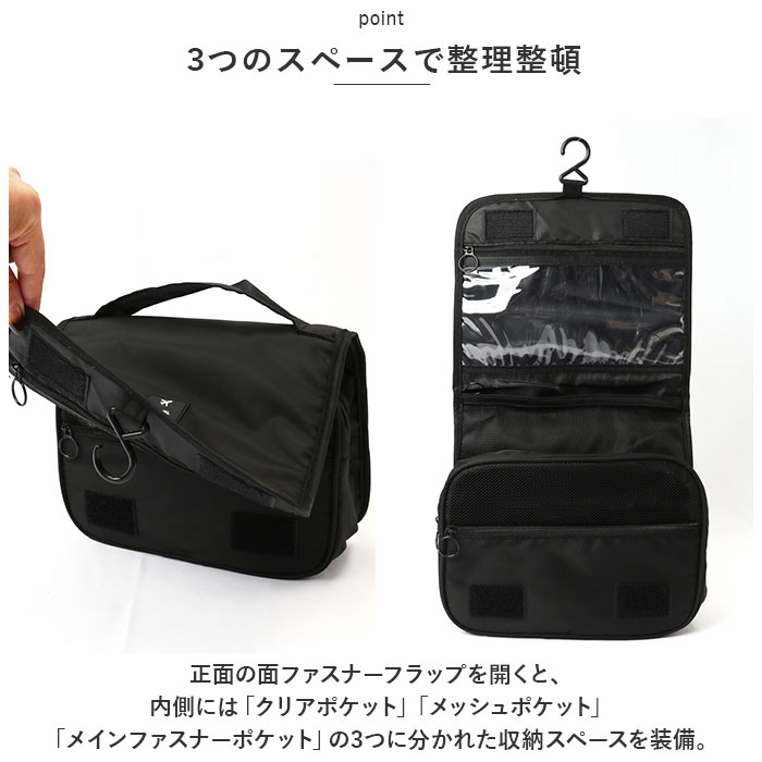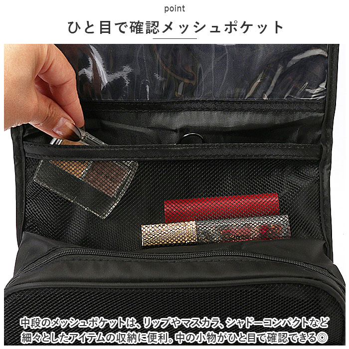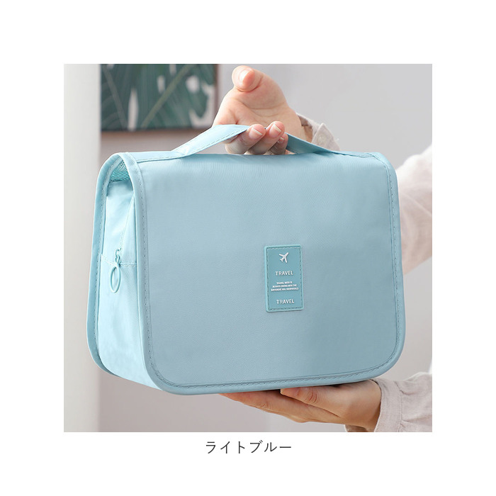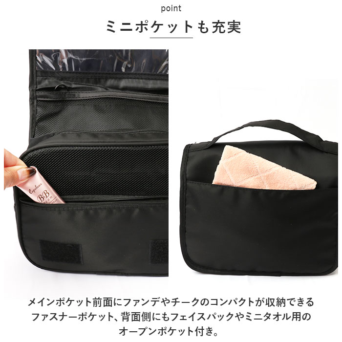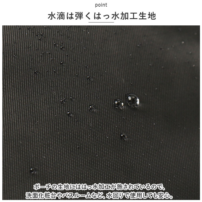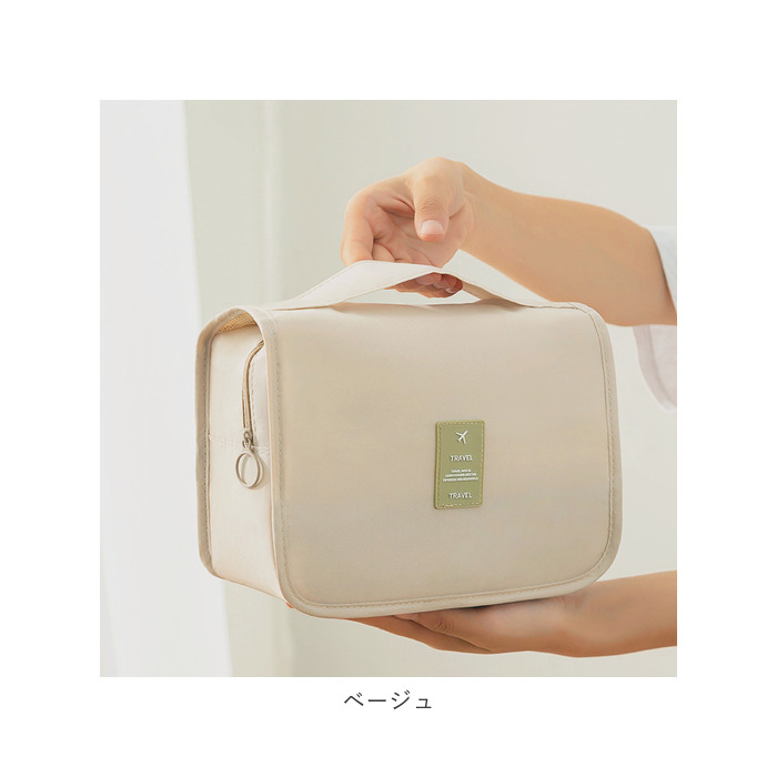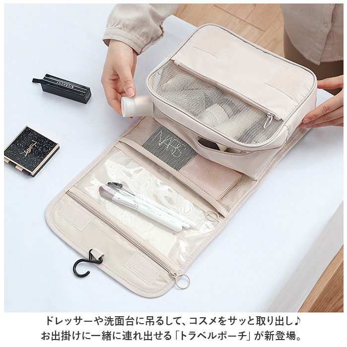 | ・ドレッサーや洗面台に吊るして、コスメをサッと取り出し♪お出掛けに一緒に連れ出せる「トラベルポーチ」が新登場。 【吊り下げて壁掛け収納に】 ・コスメやメイク道具がすっきり収納できる、小ぶりに見えてたっぷり入るコスメポーチ。フックでホテルの洗面台に吊るせば、便利な壁掛け収納に変身! 【3つのスペースで整理整頓】 ・正面の面ファスナーフラップを開くと、内側には「クリアポケット」「メッシュポケット」「メインファスナーポケット」の3つに分かれた収納スペースを装備。 【防水クリアポケット】 ・上段のクリアポケットは、濡れたものを入れても安心な防水ポケット。衛生的にしまいたいメイクブラシや歯ブラシなどの洗面用具の収納に最適。 【ひと目で確認メッシュポケット】 ・中段のメッシュポケットは、リップやマスカラ、シャドーコンパクトなど細々としたアイテムの収納に便利。中の小物がひと目で確認できるのが嬉しいポイント。 【大容量メインポケット】 ・ファスナーで開くメインポケットにはミニ化粧水ボトルやフレグランスなどを立てたまま収納可能。仕切りやサイドポケット、ゴムベルトでボトルが固定できるから、ぐらつきや液漏れもしっかり防止。 【ミニポケットも充実】 ・メインポケット前面にファンデやチークのコンパクトが収納できるファスナーポケット、背面側にもフェイスパックやミニタオル用のオープンポケット付き。 【持ち運びもラクラク】 ・持ち手ハンドル付きなので、ドレッサーやバスルームまで、ポーチ単体でも持ち運びがラクちん。 【水滴は弾くはっ水加工生地】 ・ポーチの生地にははっ水加工が施されているので、洗面化粧台やバスルームなど、水回りで使用しても安心。 【使い方は自分次第】 ・コスメや洗面用具用のトラベルポーチとしてだけなく、スマホやモバイルバッテリー、イヤホンなどをまとめるガジェットポーチとしても大活躍。 |