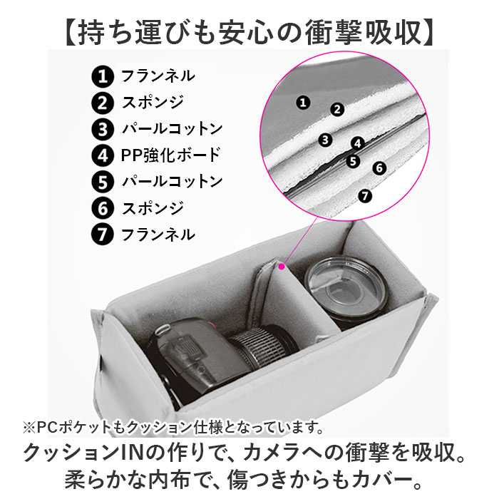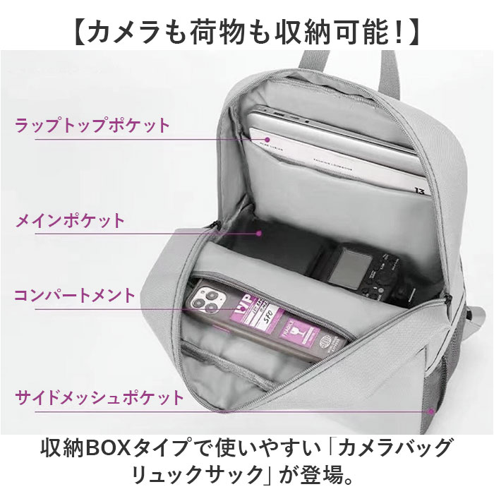 | 【カメラも荷物も収納可能!】 ・収納BOXタイプで使いやすい「カメラバッグ リュックサック」が登場。 【PCや他の荷物も収納できる】 ・カメラ収納はもちろん、作業用PCや手荷物も収納できる優れモノ!お出かけはこれ1つでOK! 【独立カメラルームを採用】 ・他の荷物とカメラは分けてしまえる、独立型で使いやすい。サイドからも引き出せるBOX仕様。 【持ち運びも安心の衝撃吸収】 ・クッションINの作りで、カメラへの衝撃を吸収。柔らかな内布で、傷つきからもカバー。 ・※PCポケットもクッション仕様となっています。 【動かせる仕切りつき!】 ・面ファスナーで固定できる、クッションINの仕切り板を採用。自分仕様でカメラをホールド◎ 【三脚収納もできる!】 ・バッグ底には、三脚をはさめるベルトを搭載。アイテムに合わせて長さ調節可能。 【自立するスマート設計】 ・リュックが自立するから、床や地面に置いてもクタっとせず様になる。扱いやすさもポイント。 【ポケット仕様】 ・フロント:ファスナーポケット×1 ・サイド:オープンポケット×1 ・メイン:PCポケット×1、ファスナーポケット×1 |