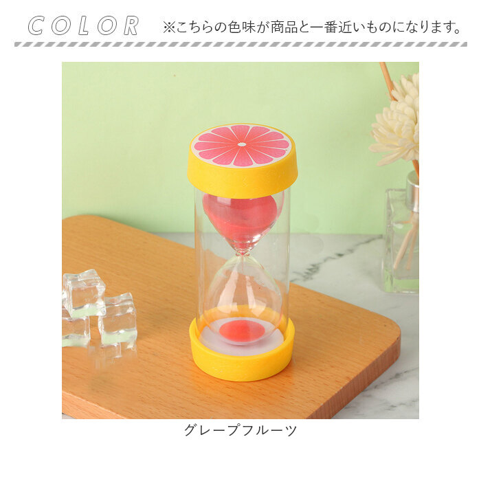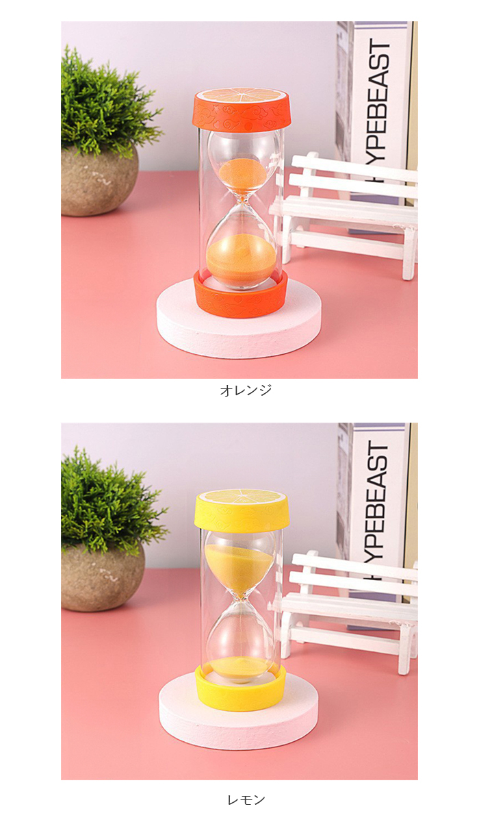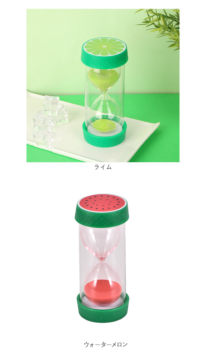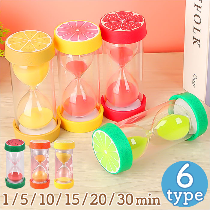 | ・手軽に時間を測れる!置いておくだけでインテリアになる砂時計♪ 【ひっくり返すだけで簡単】 ・スマホやキッチンタイマーなどのデジタル機器と違って、時間を測りたい時に上下にひっくり返すだけ!いざという時にも便利な、設定不要のアナログ構造。 【シーンに合わせて使える6タイプ】 ・1分・5分・10分・15分・20分・30分の6タイプをラインナップ!用途に応じて使い分けOK。(※製品の特性上、時間は目安となります。) 【カラフルなフルーツデザイン】 ・お部屋がパッと明るくなる、ポップなカラーリング♪台座の部分にフルーツデザインを取り入れ、並べて置いても可愛い!インテリアのアクセントに。 【リラックスタイムのお供に】 ・ぼーっと眺めているだけで、ゆったりとした時間を感じさせてくれる!忙しい毎日の中に癒やしの時間を。 【知育道具としても活躍】 ・歯磨きや朝の準備、ゲーム時間・・・。お子さまが時間の感覚を身につけるトレーニングにもおすすめ◎ |