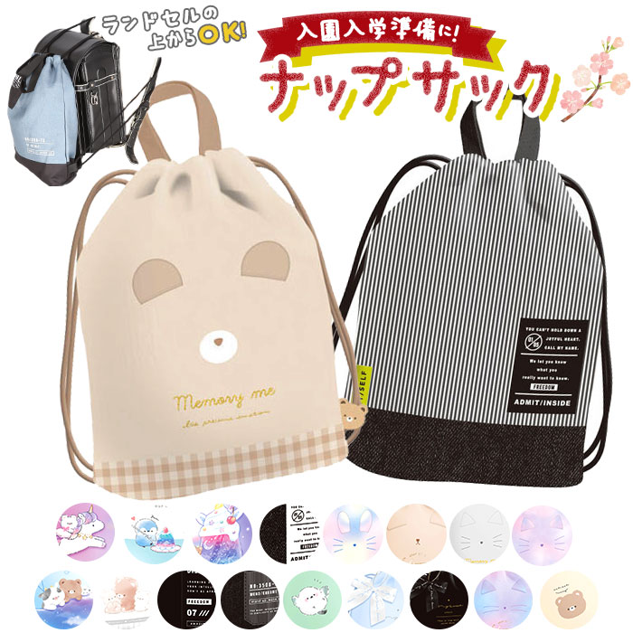 | ・体操着入れやお道具入れに最適なナップサック★ ・サイドの巾着紐をキュッと絞るだけでラクラク開閉◎ ・持ち手が付いているから、手提げとしても使用OK。 ・紐の結び目の位置を変えることで長さ調節が可能。お子様の成長に合わせて使えるのがうれしい♪ ・紐を長めにすると、ランドセルの上からも背負えて便利! ・内側にクラスとお名前が書けるネームラベル付きだから、お友達の物と間違える心配なし♪ ・通園・通学用や入園・入学準備のプレゼントしてもおすすめ。(※カラーによりデザインが異なります。メモリークマとメモリーウサギは耳とフェルトタグ付き。) |
