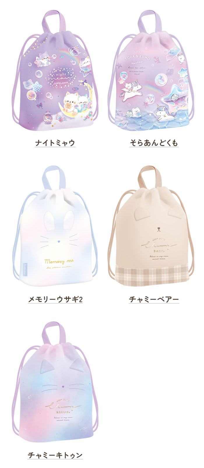 | ・体操着入れやお道具入れに最適なナップサック★ ・サイドの巾着紐をキュッと絞るだけでラクラク開閉◎ ・持ち手が付いているから、手提げとしても使用OK。 ・紐の結び目の位置を変えることで長さ調節が可能。お子様の成長に合わせて使えるのがうれしい♪ ・紐を長めにすると、ランドセルの上からも背負えて便利! ・内側にクラスとお名前が書けるネームラベル付きだから、お友達の物と間違える心配なし♪ (※)デザインによりネームラベルの位置が異なります。 ・通園・通学用や入園・入学準備のプレゼントしてもおすすめ。(※カラーによりデザインが異なります。メモリークマとメモリーウサギは耳とフェルトタグ付き。) |