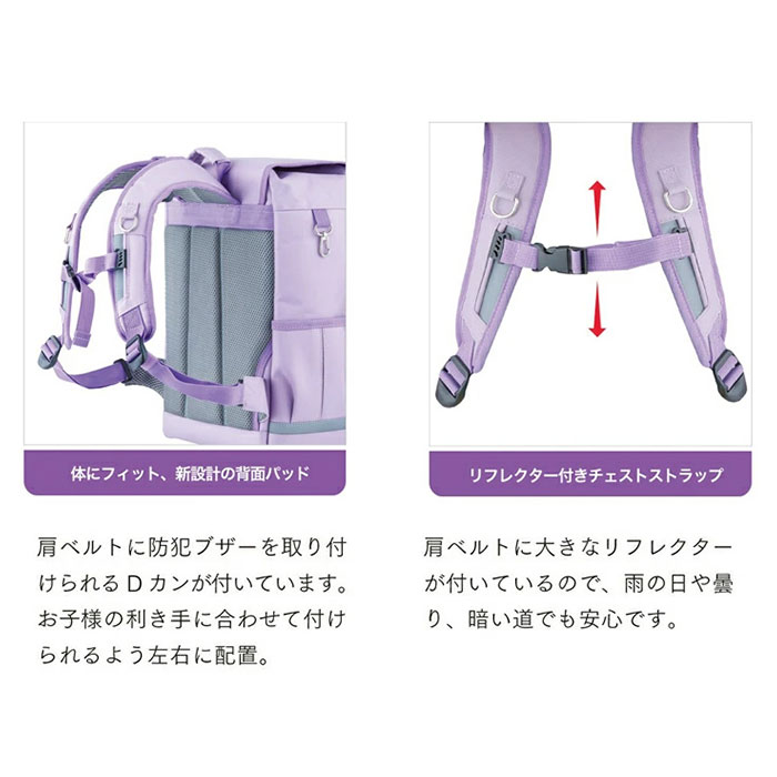 | ・登校時の負担を減らしたい、小学生のための新しい通学スタイル!軽量で荷物の重さを感じにくいランドセル「ラクサックジュニア小」が登場。 ・これひとつにすべての持ち物が入り、見た目も機能も頼りになるラクサック。 ・A4クリアファイル対応で低学年向け。 ・フラップの留め具はマグネット式ロックを採用。磁石の力で簡単に留まり、外れにくい構造。外す時は右へスライドさせる仕様。 ・メイン収納はラウンドファスナー仕様で中に入れている物が見えやすくて使い勝手が良い。 ・カバンの中で揺れがちな様々な教科書類をしっかり固定、揺れを軽減し、体への負担を最小限に抑えてくれるブックストラップを採用。 ・時間割表やネームカードがそれぞれ入れられるクリアポケット付き。(時間割表はホームページにてダウンロードが出来ます。) ・リュックのショルダー部分はリフレクター付きチェストストラップを採用。体型に合わせて自由に位置を設定でき、ストラップのずり落ち防止や歩行時の揺れを抑え、密着性を高めてくれる。 ・また左右にDカンが付いていて利き手に合わせて防犯ブザーを取り付け可能。 ・背面パッドが体にフィットするので毎日の通学が負担になりにくい。 |