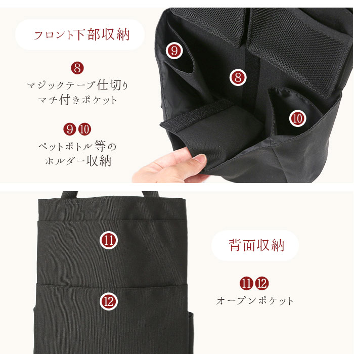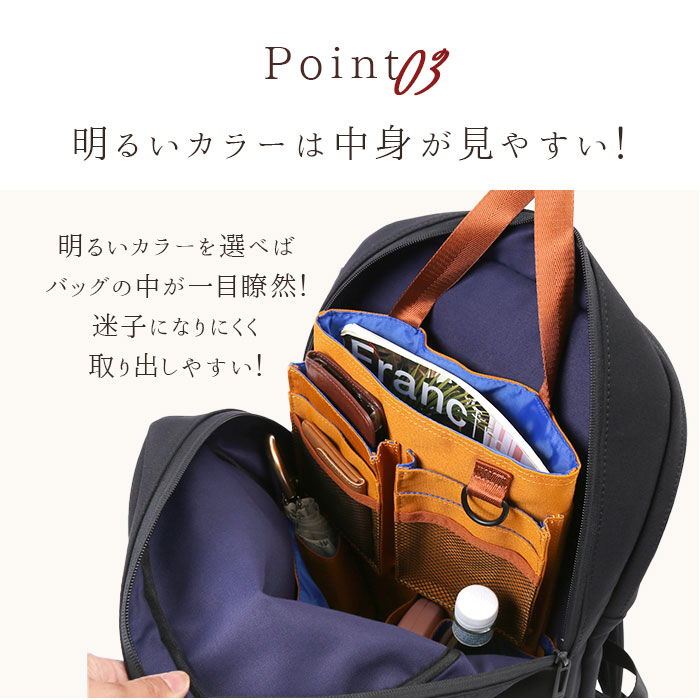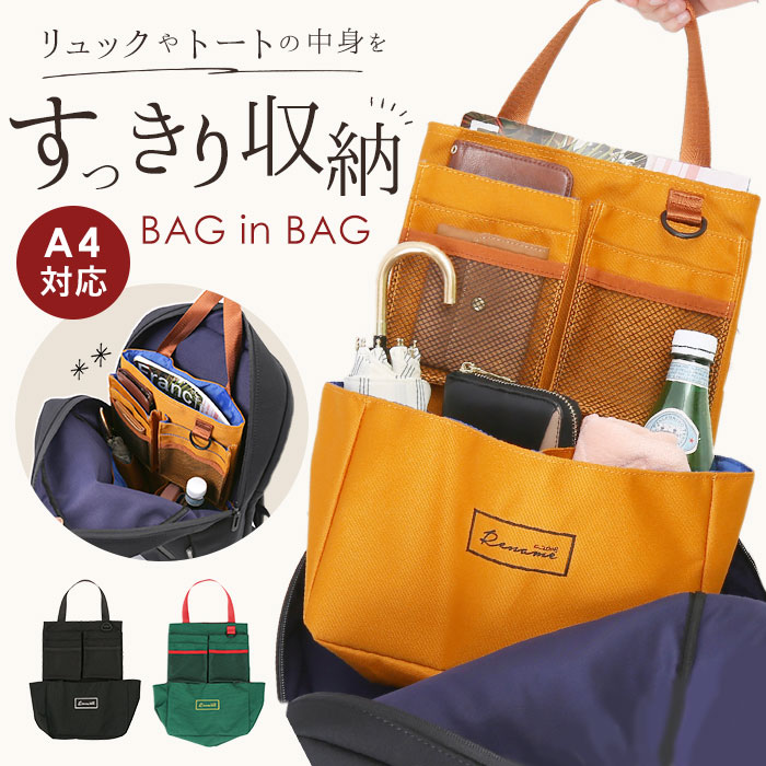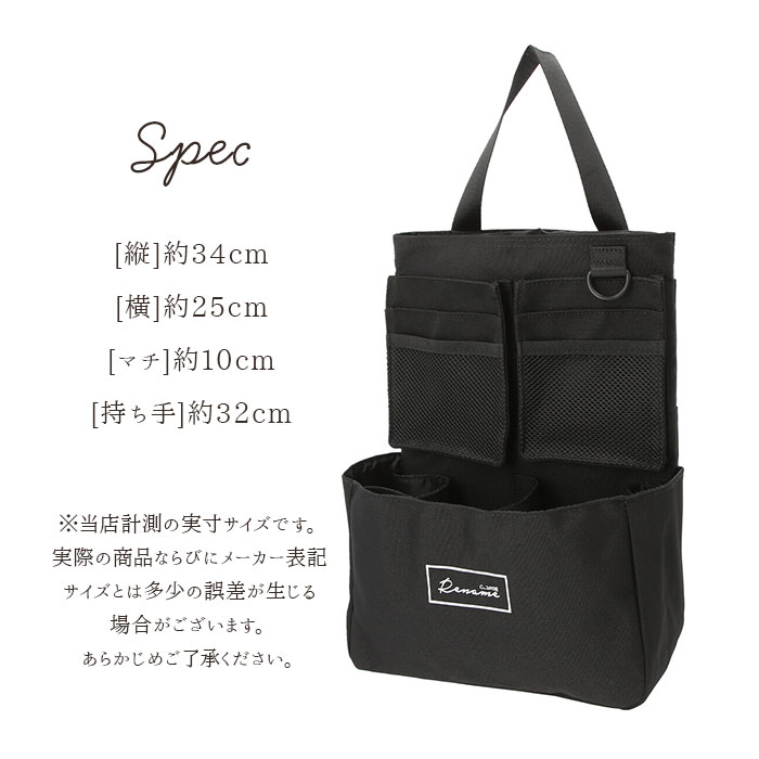 | ・バッグの中の空間を最大限に活用して荷物を整理できる「Rename バッグインバッグ」が登場。 ・持ち手の付いた縦長のメイン収納スペースは、A4ファイルを立たせた状態ですっぽりと収納できるサイズ感。 ・縦長の収納スペースの前面上部には、オープンポケット×6(うち、2つはメッシュポケット)。さらに背面にも高さの違うオープンポケット×2を配置して、小物がすっきり整理できる! ・前面下部のマチ付きポケットには、お弁当箱や手帳・スマホなど、荷物のサイズに応じて付け外しが可能なマジックテープ式の仕切り付き。 ・両サイドには便利なホルダー付き。500mlペットボトルや折り畳み傘を入れられる。 ・バッグから簡単に取り出せる持ち手や鍵などを引っかけられるDカンなどデイリーユースに便利な機能が♪ ・カラーリングや刺繍デザインにこだわったお洒落なデザインも魅力。 ・リュックだけでなく縦型のトートバッグにもOK。 ・バッグインバッグとしてはもちろん、家の中での収納インテリアとしてもおススメ。 |