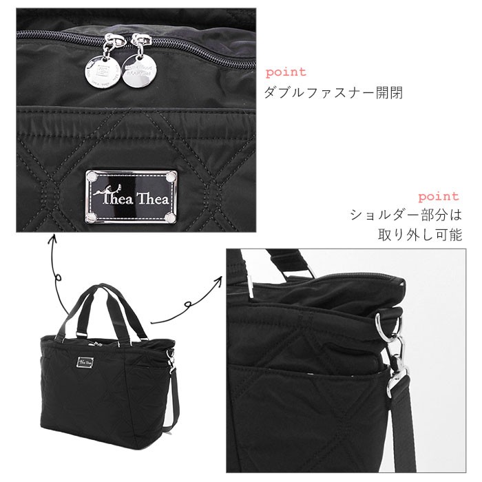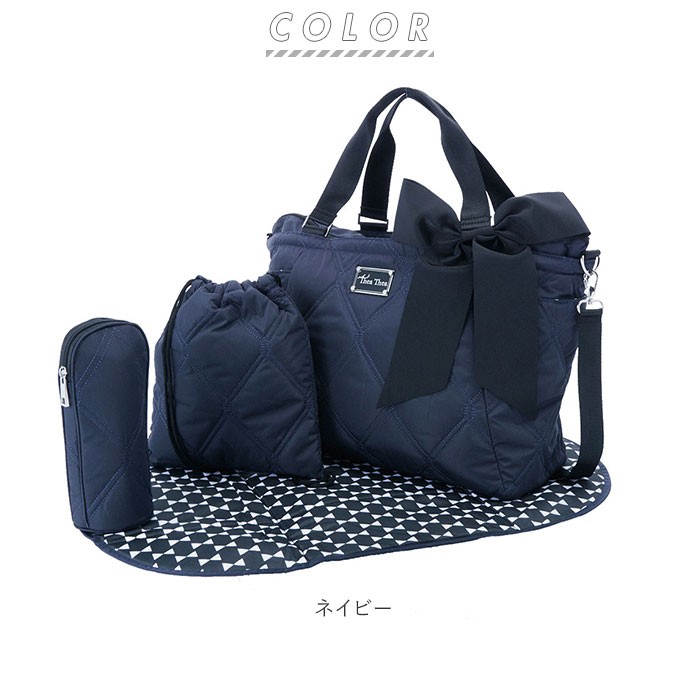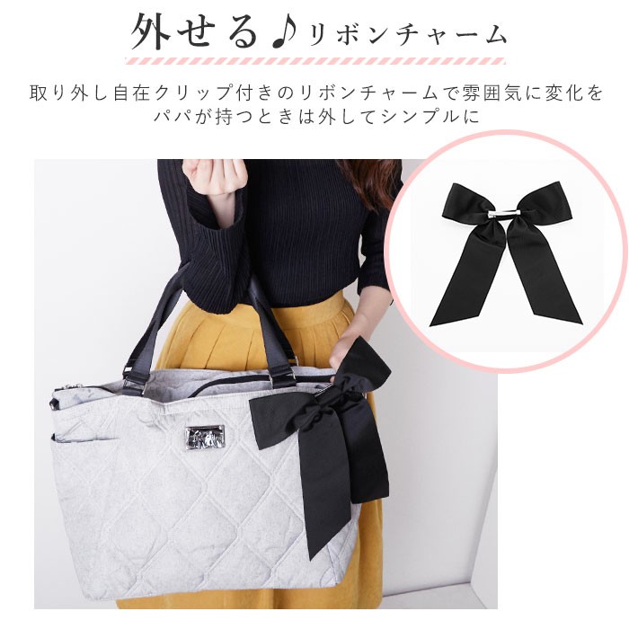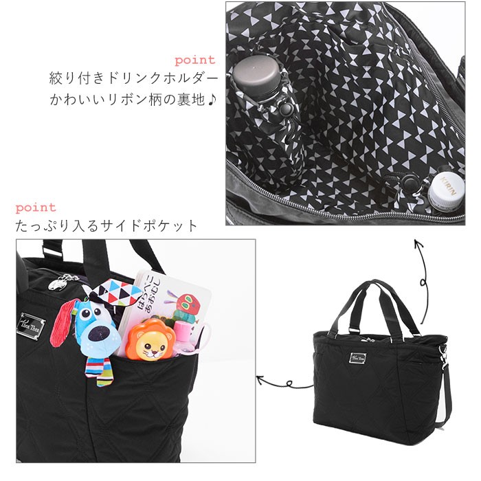 | ・品のあるカラーで、収納力抜群のマザーズバッグです。トートバッグとして、またベルトをつけてショルダーバッグとしても使える2wayタイプ。 ・軽量ナイロンキルティング素材で、トートバッグのみの重量は約536g!大容量なのに、肩にかけた時にとっても軽い♪ ・おむつ替えシート、ボトルケース、おむつ入れ巾着が付属します。 ・しっかり開くメインポケットは使いやすく、裏地にかわいいリボン柄の生地を使用。 ・外側の両サイドに、たっぷりサイズのオープンポケット×2。内側にもマグネットボタン付きのポケット×1、オープンポケット×2、ペットボトル(哺乳瓶)ホルダー付き。 ・トートバッグの正面には「Thea Thea」のスタイリッシュなロゴプレート付き。持ち手にはエレガントな飾りリボンが付いています(取り外し可能)。 |