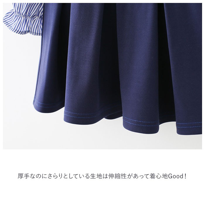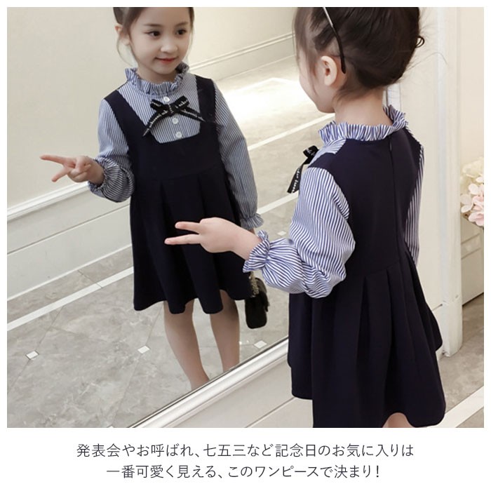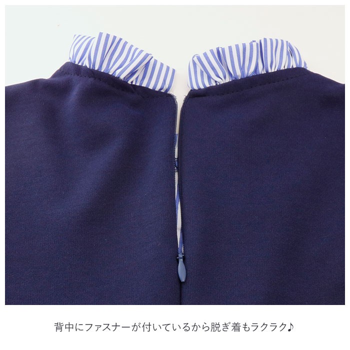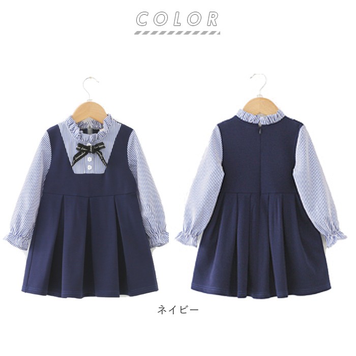 | ・フォーマル感漂うクラシカルなワンピースで気分はお嬢様♪ふわりと広がるプリーツフレアスカートと胸元のリボンが可愛い★ ・厚手なのにさらりとしている生地は伸縮性があって着心地Good!背中にファスナーが付いているから脱ぎ着もラクラク♪ ・落ち着いたネイビーのオーバースカートと爽やかなストライプ柄のブラウスを重ね着しているようなレイヤード感がとっても上品。 ・発表会やお呼ばれ、七五三など記念日のお気に入りは一番可愛く見える、このワンピースで決まり! |