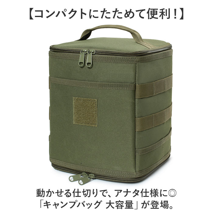 | 【コンパクトにたためて便利!】 ・動かせる仕切りで、アナタ仕様に◎「キャンプバッグ 大容量」が登場。 【あらゆるキャンプグッズを収納】 ・ランタン、ガスタンク、コンロ、LEDライト、シェラカップなど。必要な小物をすっぽり収納。 【持ち運びに便利な折りたたみ式】 ・ファスナーを開け、パタッと折りたためばコンパクトに。使わない時も置き場所をとらない。 【自分仕様にアレンジ可能】 ・取り外しや、お好みの場所につけられる仕切り板を搭載。荷物に合わせて面ファスナーで調整◎ 【汚れに強い撥水生地を採用】 ・屋外での使用にぴったりな、撥水生地。突然の雨でも安心&汚れにも強い!※完全防水ではありません。 【しっかり自立するから使いやすい】 ・型崩れがしにくい、硬めの作り。バッグが自立するから扱いやすく、長く愛用できる。 【外側ポケット&ベルトつき】 ・外側にはオープンポケットと、小物を引っかけられるベルトつき。使い勝手良し◎ |