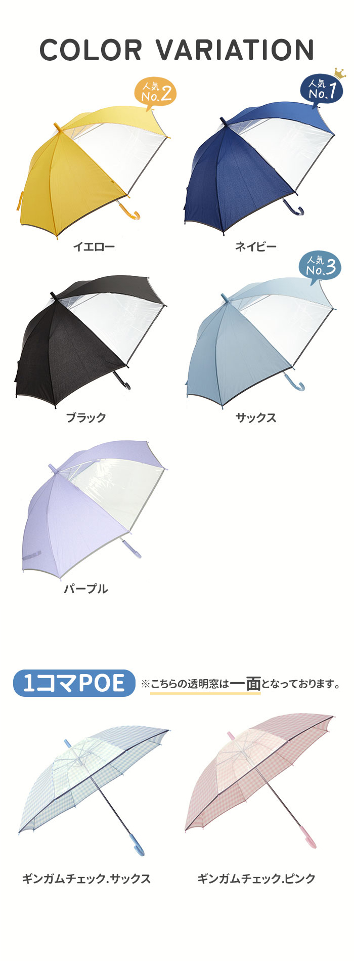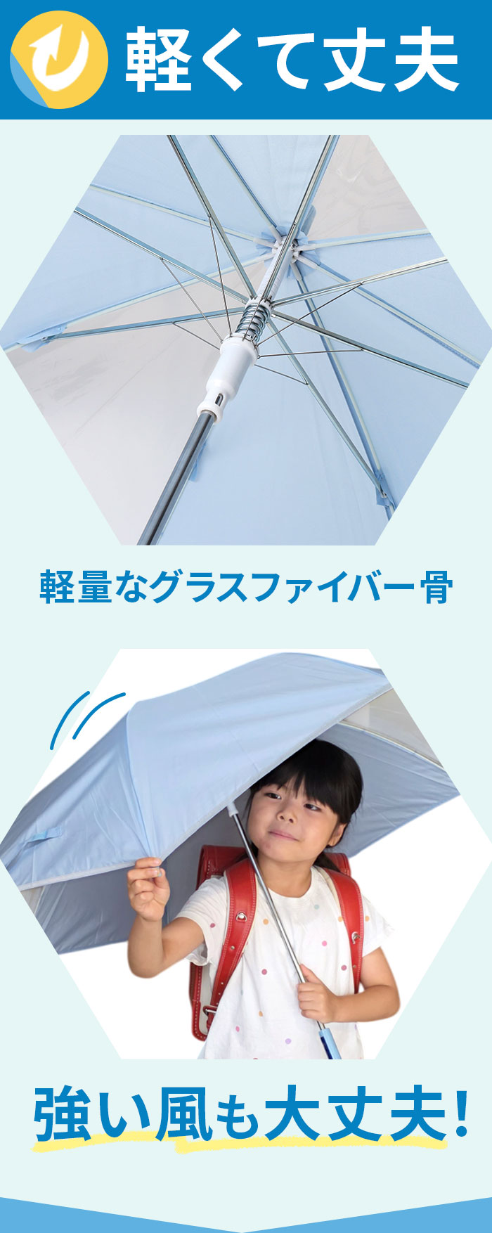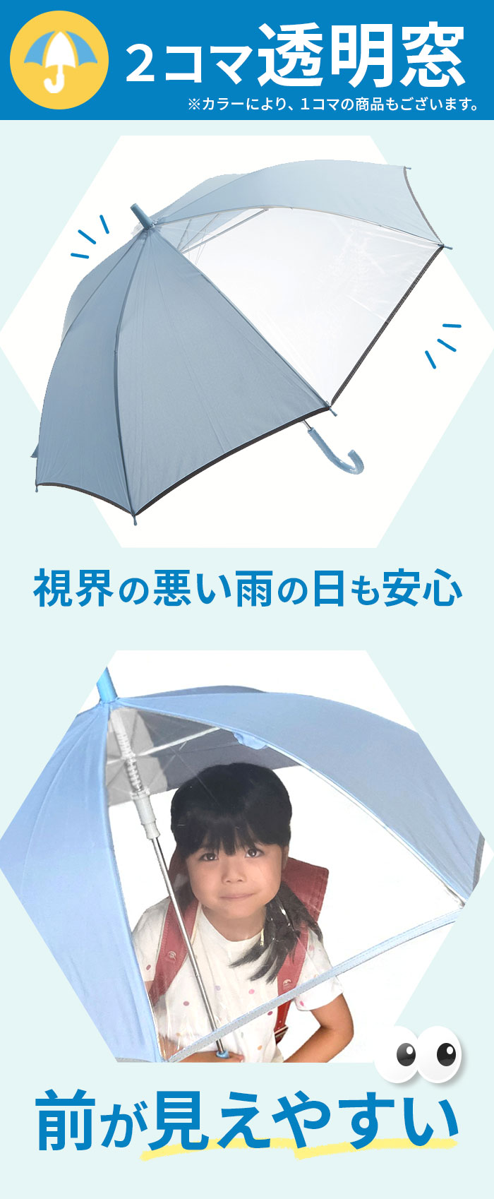 | グラスファイバー骨を使用し、丈夫で軽いワンタッチ開閉式のキッズ傘です。 透明窓が2か所あり、前が見えます。(※カラーにより透明窓の数が違います) また、傘のまわりは反射材がついているので、夜道でヘッドライトの光を反射し、安心です。 |