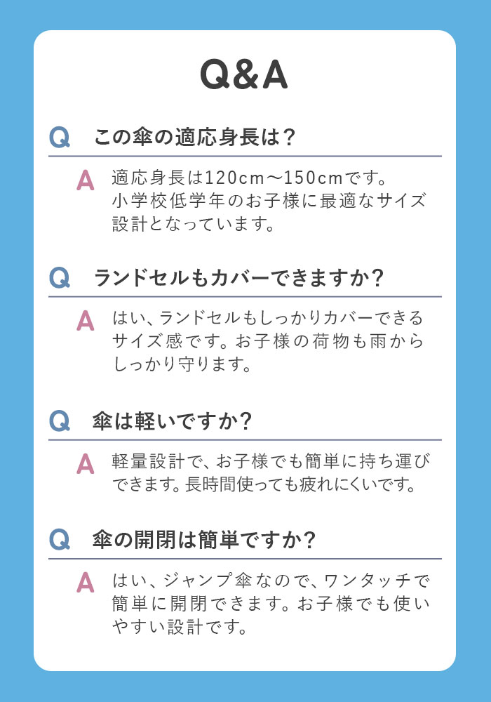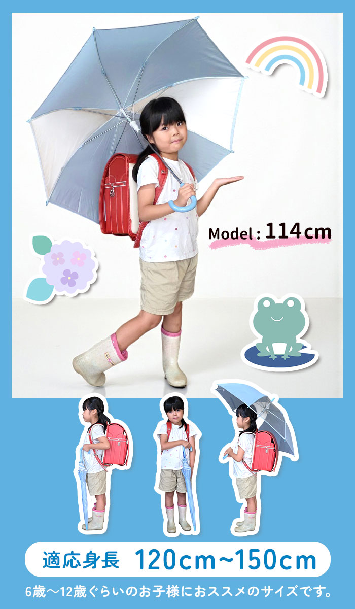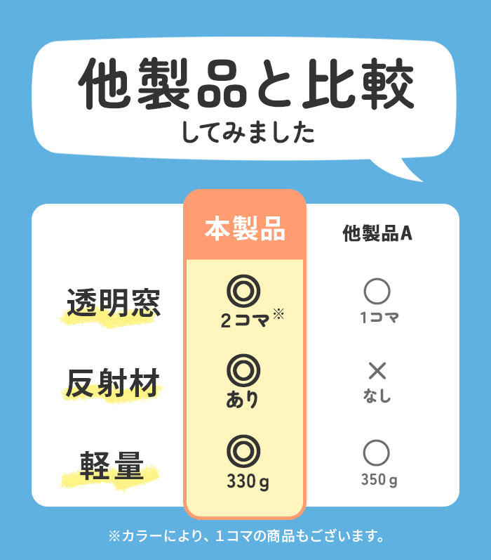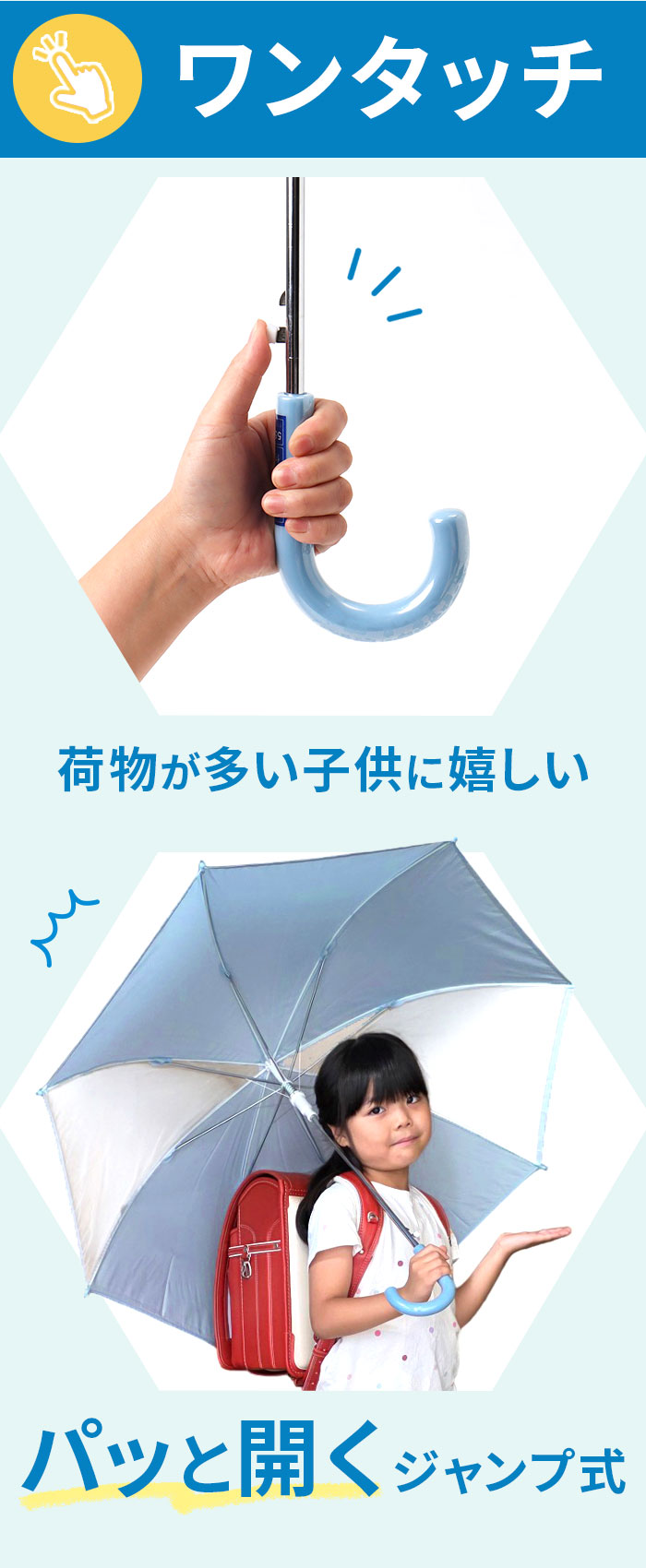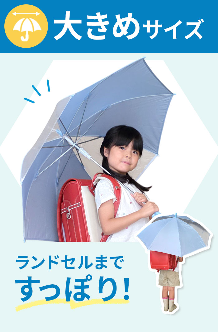 | グラスファイバー骨を使用し、丈夫で軽いワンタッチ開閉式のキッズ傘です。 透明窓が2か所あり、前が見えます。(※カラーにより透明窓の数が違います) また、傘のまわりは反射材がついているので、夜道でヘッドライトの光を反射し、安心です。 |