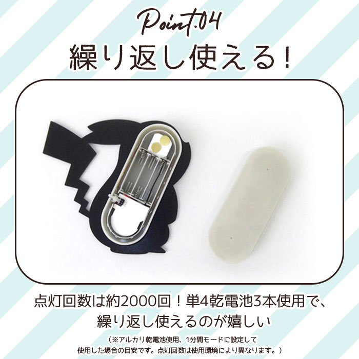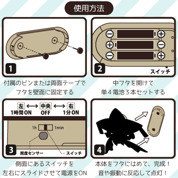 | ※壁に取り付けるウォールライトです。用途以外のご使用はお避け下さい。 ※アルカリ乾電池またはマンガン乾電池をご使用ください。充電式(ニカドなど)電池、ニッケル水素乾電池は、動作に問題が発生する可能性がありますので使用しないでください。 ※新しい乾電池と古い乾電池、アルカリ乾電池とマンガン乾電池などの異種の乾電池を混ぜて使用しないでください。 ※乾電池は電池ケースの+−をご確認の上、正しく入れてください。(電池の向きは同じではありません) ※長時間使用しない場合はスイッチをOFFにし、乾電池を抜いて保管してください。 ※発熱や発火・感電の原因になりますので、濡れた手で電池交換をしないでください。 ※保管の際は、ペットやお子様の手の届かないところに置いてください。 ※お子様が使用する場合、電池交換は保護者の方が行ってください。 ※本体裏面のケースの中にピンが入っています。針先は鋭く尖っておりますので、取り扱いには十分ご注意ください。 ※変形したピンは使用しないでください。 ※本製品の取り付けは重量に耐えうるところに確実に行ってください。取り付けに不備があると落下するおそれがあります。 ※コンクリートや一部の壁材によってはピンが刺さらない場合があります。 ※再剥離可能な強粘性両面テープを使用していますが、フタを壁面から取り外す際、壁の表面がはがれたり傷んだりすることがありますのでご注意ください。 ※商品を取り付けた後、大きな衝撃(体をぶつける、手で叩くなど)を与えないでください。また、水を含めた液体などがかからないようにしてください。故障や破損のおそれがあります。 ※落としたり振り回したりしないようご注意ください。衝撃により破損することがあります。破損した場合は絶対に使用しないでください。 ※暖房機や火気の近く、電化製品の上など熱の帯びやすい場所、直射日光の当たる場所では使用しないでください。 ※屋外や湿気の多い場所(浴室など)では使用しないでください。 ※防水ではありませんので取り扱いには十分ご注意ください。 ※カメラやモニターの性質により、画像と実物の色の違いがある場合がございますのでご理解願います。 ※点灯回数:約2000回使用可能(アルカリ乾電池を使用しており、且つ1分間ONに設定した時。明るい場所では点灯しません。使用環境によって変動します。) |