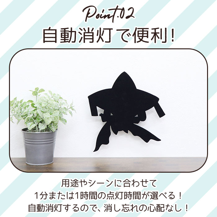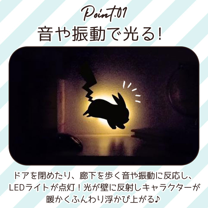 | ・可愛いポケモンキャラクターたちと一緒に暮らそう♪手元や足元を、ほんのり明るく照らしてくれる「ポケモン ウォールライト」が登場。 ・壁面に取り付けるLEDウォールライト。玄関ドアを閉めたり、廊下を歩く音や振動に反応してライトが点灯、光が壁に反射しキャラクターがふんわり浮かび上がる♪ ・用途やシーンに合わせて1分または1時間の点灯時間が選べる!合わせた時間で自動消灯するので、消し忘れの心配なし! ・点灯回数は約2000回!別売りの単4乾電池3本使用で、繰り返し使えるのが嬉しい。(※アルカリ乾電池使用、1分間モードに設定して使用した場合の目安です。点灯回数は使用環境により異なります。) ・周囲が明るい時には点灯しない照度センサー付きだから、とってもエコ◎ ・付属の壁面取付用ピン2本または両面テープで、壁への取り付けもカンタン。 ・表面に植毛シートを使用し、フワフワな撫で心地♪昼間はインテリアとして、夜はちょっとした間接照明として活躍。 |