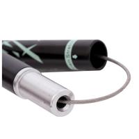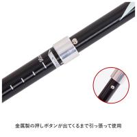 | [組み立て方法] (1)本体を自然に広げる。 (2)クリップハンドル下の黒いレバーロックを持ち上げて解除し、第2段目を引き出す。 (3)さらに第3段目を丸いボタンが出るまで引き出し、全部で第5段目のポールまで出ていることを確認しはめ込む。 (4)第1段目と第2段目のポールの長さを調節する。お好みの長さになったら黒いレバーを下げ、レバー横の白いナットを閉め固定する。 |