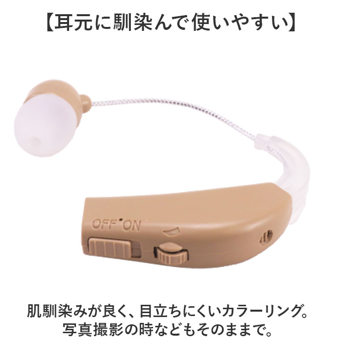 | 【会話や音が聞こえにくい時に】 ・周囲の音を集めて、聞き取りやすくサポート。「充電式集音器」。 【左右対応できる片耳タイプ】 ・手軽に使える、片耳タイプの集音器。両耳どちらにも、耳に掛けるように装着。 【約2時間の充電で終日使用可能】 ・面倒な電池交換不要で、経済的な充電式。付属のスタンドにセットするだけで充電OK。 【どなたでも簡単操作でノンストレス】 ・電源スイッチはスライド式。音量は回すだけでお好みの大きさに調節できる、ダイヤル式。 【耳元に馴染んで使いやすい】 ・肌馴染みが良く、目立ちにくいカラーリング。写真撮影の時などもそのままで。 【耳のサイズに心地よくフィット】 ・イヤホンキャップは6個付属しており、簡単に付け替え可能。お掃除ブラシ付き。 【すっきりまとめて、迷子知らず】 ・全て一緒に収納できる、スタイリッシュなケース付き。旅行や会議等への持ち運びにも便利。 (※)内側にメッシュポケット付きです。 |